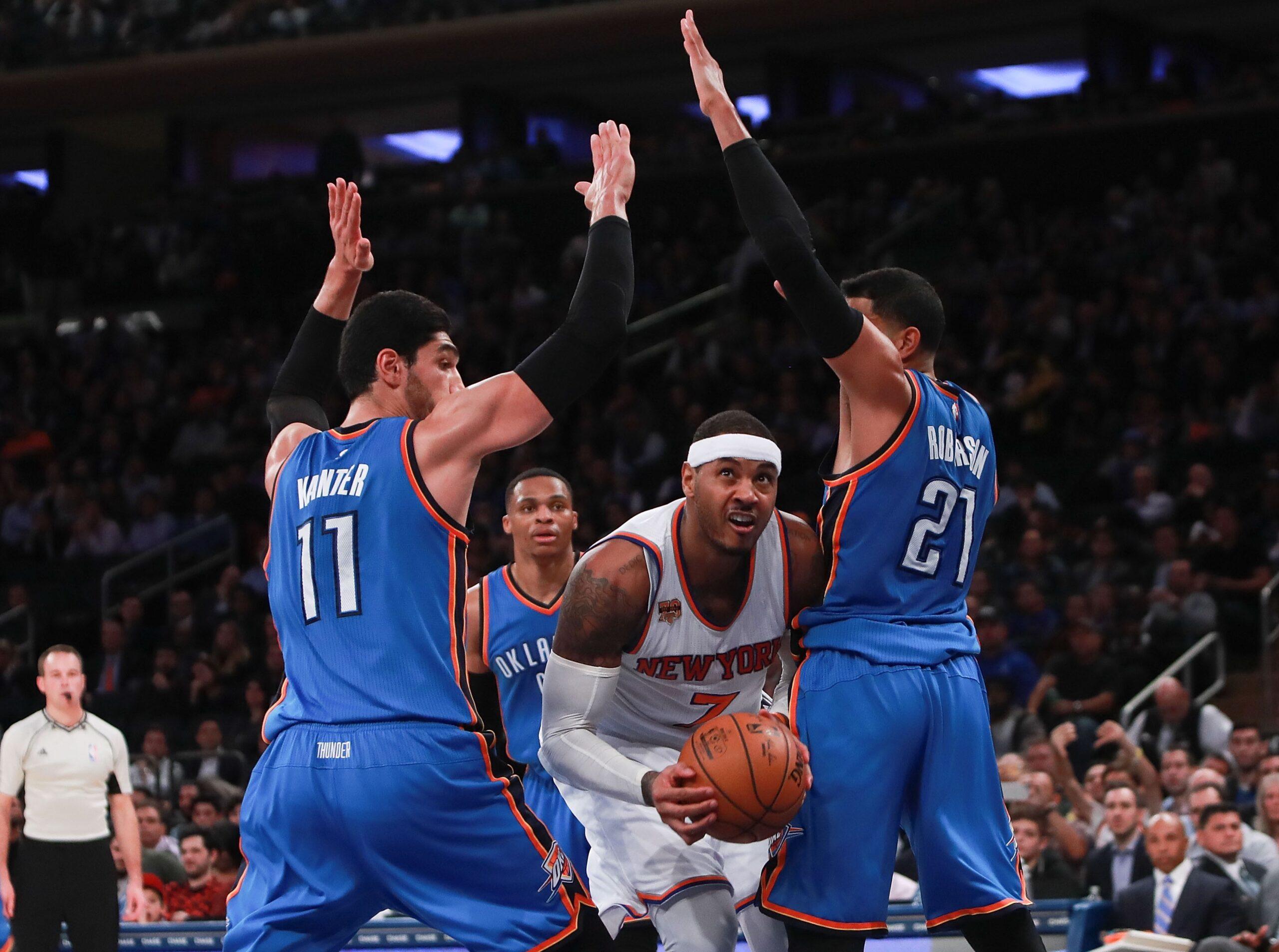Here’s the flip side: If the stars can put their egos aside, the Thunder would be able to trot out a lethal first unit. With George as a secondary offensive option behind Russ, and Melo as a third option, OKC would have a nearly unguardable number of offensive options. If Melo becomes a spot-up shooter waiting for Russ to drive and kick or for George to pass out of a double-team, he’s going to get a lot of open shots. And it seems likely that Melo will make them, just like he has on loaded Olympic teams. For all the griping about how underwhelming he’s been in New York, Anthony is still a lethal scorer who could reach peak efficiency in a system in which he’s not the focal point.