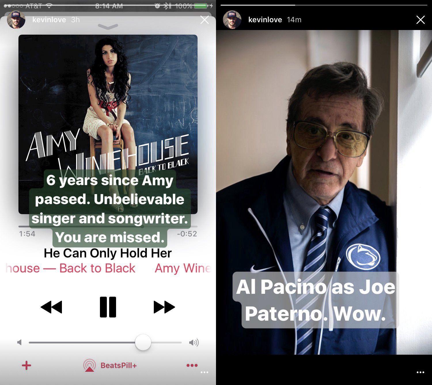 Instead of an Instagram Story where he would nod along to a song about loyalty, there’s a reaction — "Wow" — to the first photo of Al Pacino playing Joe Paterno. Where the Athlete in the Gym clip should be, Love will instead screenshot an Amy Winehouse song on the anniversary of the British singer’s death.