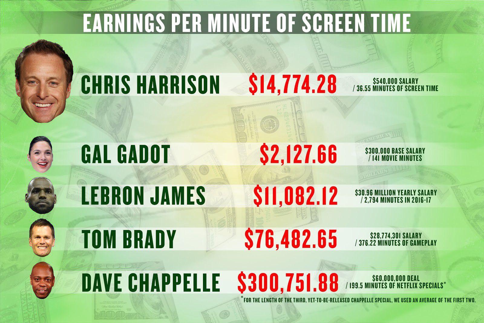 (A quick explanation of methodology. My tally does not include Harrison’s voice-overs — just the times he actually appears in the show’s plotline. For calculations of Harrison’s screen time, I started counting at the first evidence of his presence in a scene — whether it was his actual image in the frame, or merely the clacking of his approaching shoes during a rose ceremony — and stopped counting at the last evidence. As for Harrison’s salary: Multiple posts point to a TV Guide rundown of reality TV host salaries that indicate Harrison made $60,000 an episode in 2011, although the TV Guide post has been scrubbed from the internet. It’s probable Harrison’s salary has increased over the past six years — the show is much more popular now, and episodes are two hours instead of one — so it’s reasonable to assume Harrison makes significantly more per second than I was able to estimate.)