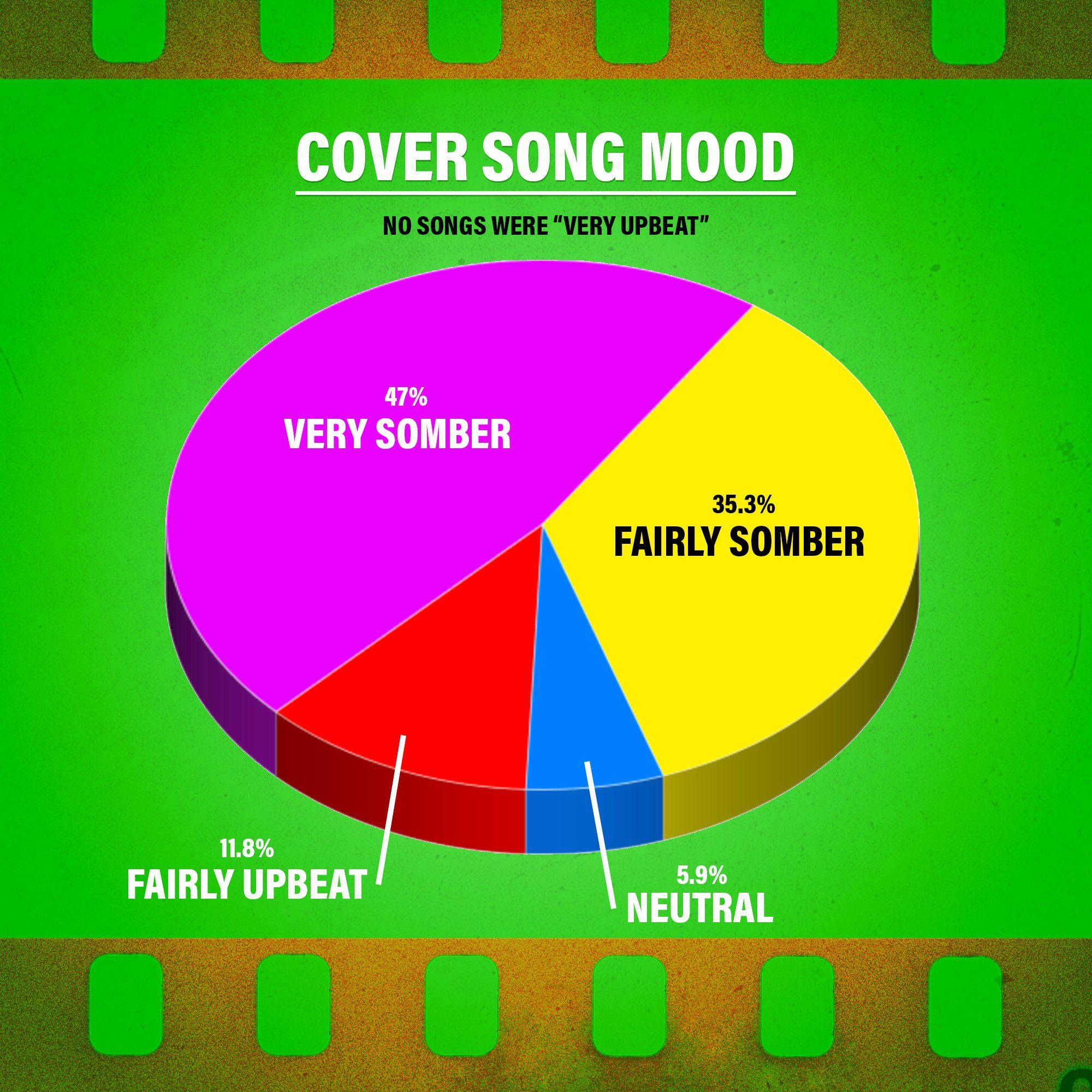 Almost half the time, the covers are of a rock song from the ’60s or ’70s. (If someone really wants to be an innovator in the "trailer cover song" space, they should drop a cover of song that’s been out for less than seven years — it’s truly never been done. Just a tip, second trailer for Murder on the Orient Express: Go really next-level and use a cover of Imagine Dragons’ "Believer.") But a true assurance in terms of these covers is their tone — they’re almost all extremely dour. Rating the songs on a scale of 1–5, 1 being "most somber" and 5 being "sincerely upbeat," a stark amount — 28 out of 34 covers — end up on the low end of the scale.