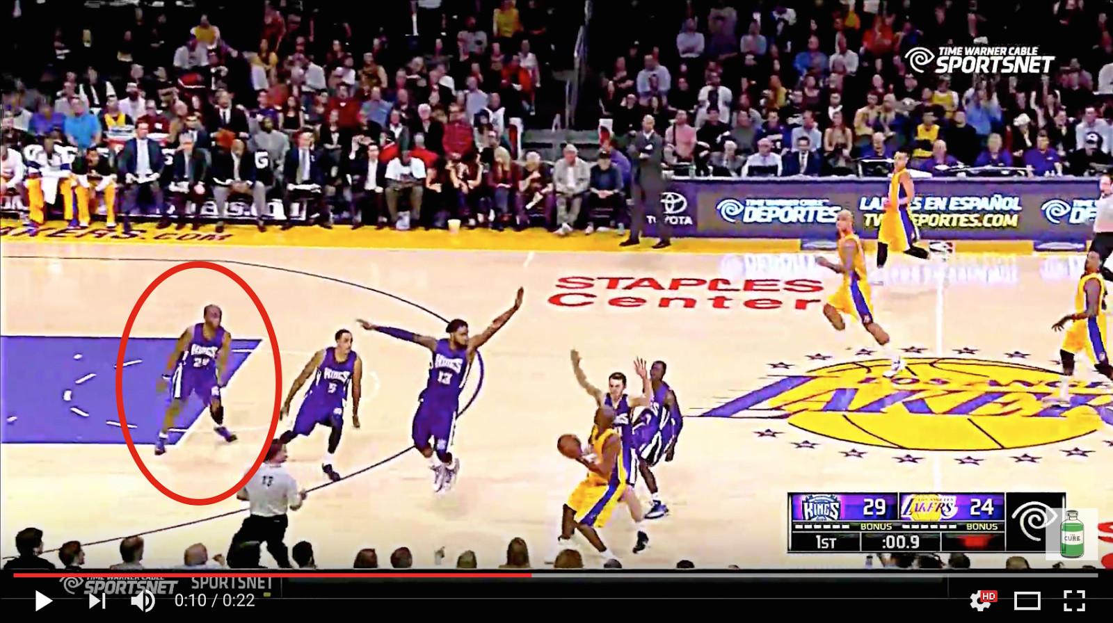 Ridiculous as the Kings shot was, Kobe really didn’t have a better option. Nobody on the Lakers even bothered to get past half court before the play was basically over. That means Kobe’s hand was forced there, because there was nowhere else for him to go with it. He had to shoot it. It was the best option because it was the only option. (Also, who was he even going to pass it to if that option had been there? The other guys on the court with him at that moment were Robert Sacre, Carlos Boozer, Jeremy Lin, and Nick Young. Give me a contested Kobe 31-footer over a wide open 10-footer from Carlos Boozer literally every time.)