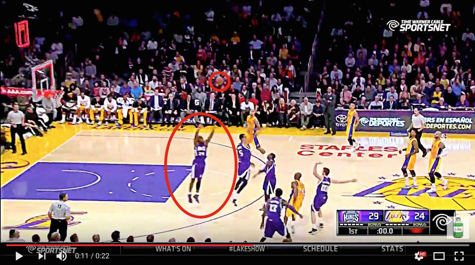 The Kings shot happened at the end of the first quarter. Darren Collison missed a free throw with 4.5 seconds left, Carlos Boozer rebounded it, then zipped it out to Kobe, who turned and sped up the court. He dribbled to a spot from where he felt like he could make a jumper (it was about 31 feet from the rim, lol), pump-faked two defenders, then jumped, double-pumped the ball again, then shot it. The ball rimmed out as the buzzer sounded.