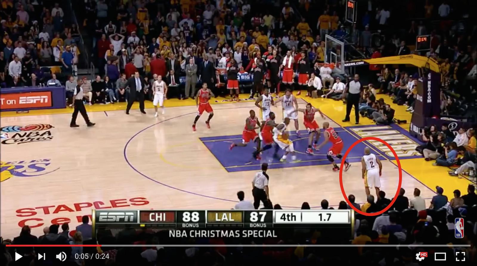 With the Bulls shot, though, Kobe had more time (4.8 seconds), less distance to cover (the Lakers had the ball on their side of the court), better players (2x NBA champion Pau Gasol, 5x NBA champion Derek Fisher, NBA champion Metta World Peace, and Steve Blake, one of the few players Kobe has ever positioned himself with), and also a way better option (Fisher, who has an entire library of clutch shots made in the regular season and playoffs, was standing wide open in the corner on the same side of the court as Kobe). Kobe ignoring all of that to go one-on-three makes the Bulls shot way Kobe-er.