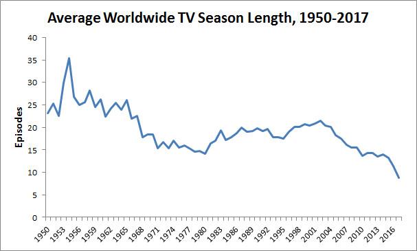 The great shortening started with cable, but it’s spread to network TV too. Even reboots from the long-season era have returned looking slimmer: Fuller House seasons are half as long as Full House’s, and although the new Will & Grace has been extended to 16 episodes, a big boost from its initial order of 10, that’s still a step down from the original run’s traditional 22–25 installments.