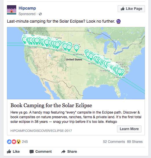 In addition to its camping catalog, Hipcamp created an interactive map that shows sites that are available along the path of totality. “We took the [geographic information system] shape from NASA and put it on our map to make people’s lives easier,” says Ravasio. “We’d just built the GIS capability recently.”