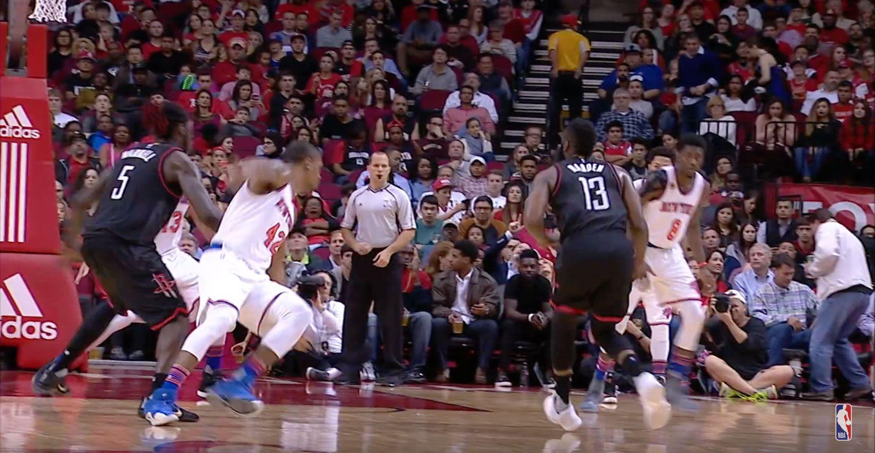Harden had the ball and he was being guarded all alone by Lance Thomas out past the 3-point line, which, I mean, you probably don’t even know who Lance Thomas is, that’s how you know it turned out badly for him. Harden dribbled in some, waited for Montrezl Harrell to come set a pick, faked like he was going toward the pick, then crossed back over the other way. Thomas, that poor soul. He had leaned with Harden toward Montrezl and then tried to jump back into defensive position when he realized it was a ruse, but his legs all of a sudden were made of toothpaste, and so he just sort of stumbled backward as Harden squared himself and fired away. Look: