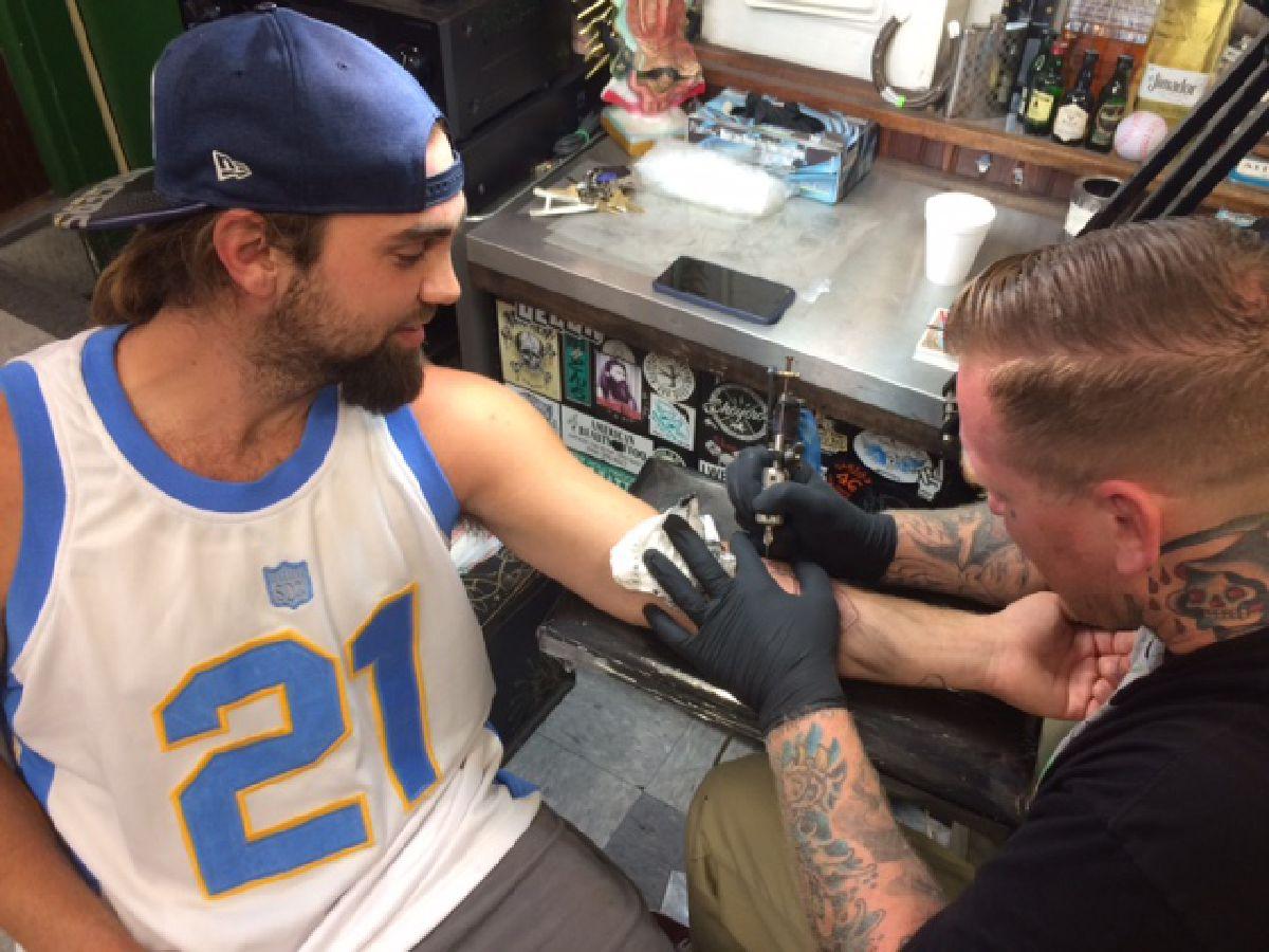 Of course, those fan bases are known for being intense. Chargers fans don’t have quite the same reputation. It made me wonder why someone would stand in line on Sunset to rep a team that just came to town—especially someone like Craig, a 26-year-old who had never gotten a tattoo before. Why? I asked him. Why now? Why the Chargers?