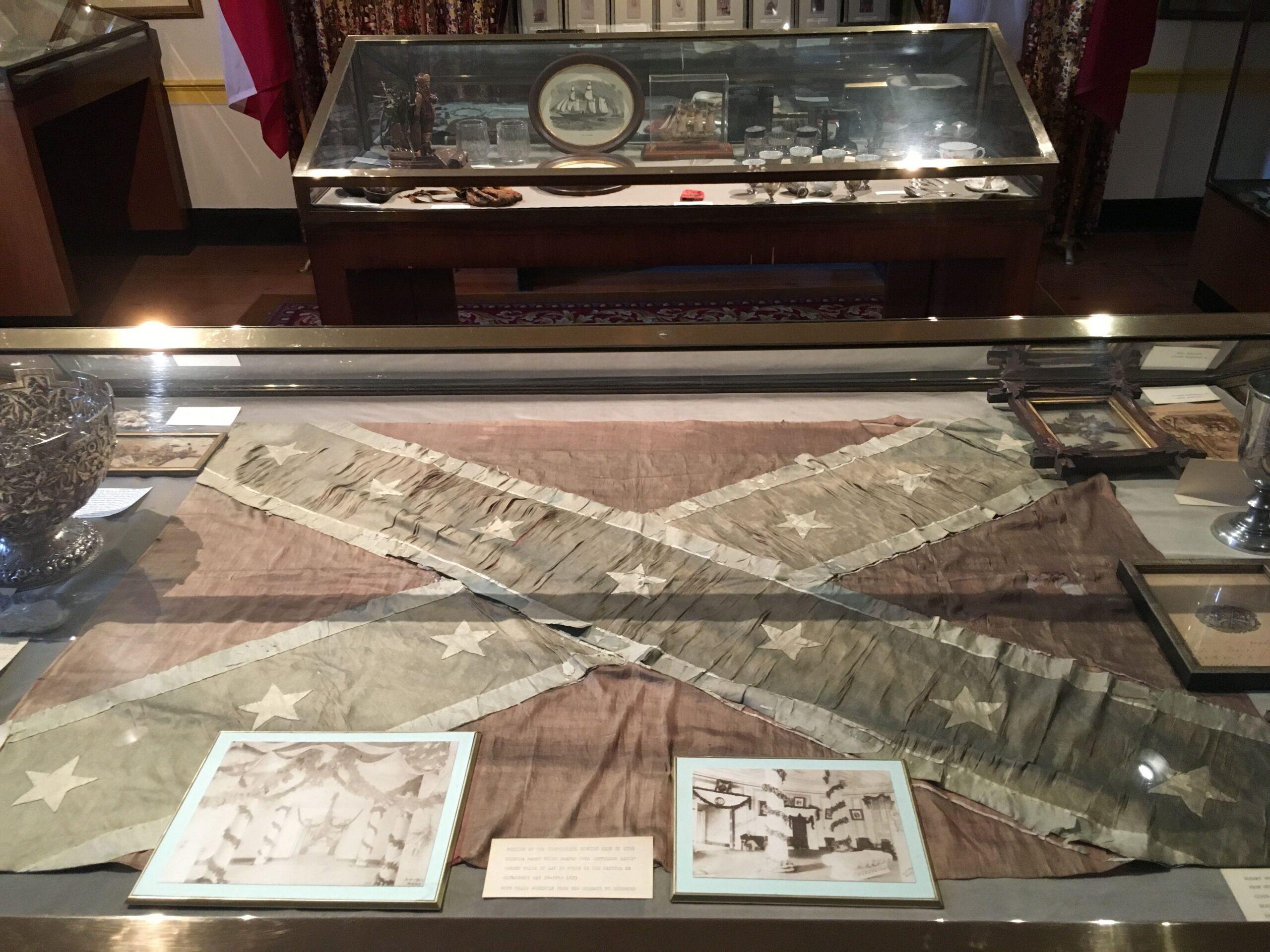 Like Montgomery, Richmond has a Confederate museum that feels frozen in time. The city boasts not only a White House, where Jefferson Davis lived for most of the Civil War, but also a Museum of the Confederacy next door that is filled with wartime artifacts. The tour of the Richmond White House has in some ways been modernized — a guide immediately identifies Jefferson Davis as a “soldier, politician, and slaveholder,” and in the foyer she shows us a note Davis wrote to allow one of his slaves, Henry, to run an errand in the city. But the museum has largely remained untouched since opening in 1974, and it shows. The primary exhibit documents the Civil War as a series of pitched military battles, with Confederate coats, rifles, and canteens encased behind glass. Robert E. Lee’s battlefield tent serves as a centerpiece, featuring items owned by the general. A floor above, dozens of tattered Confederate flags line the walls, including several versions of the famous battle flag.