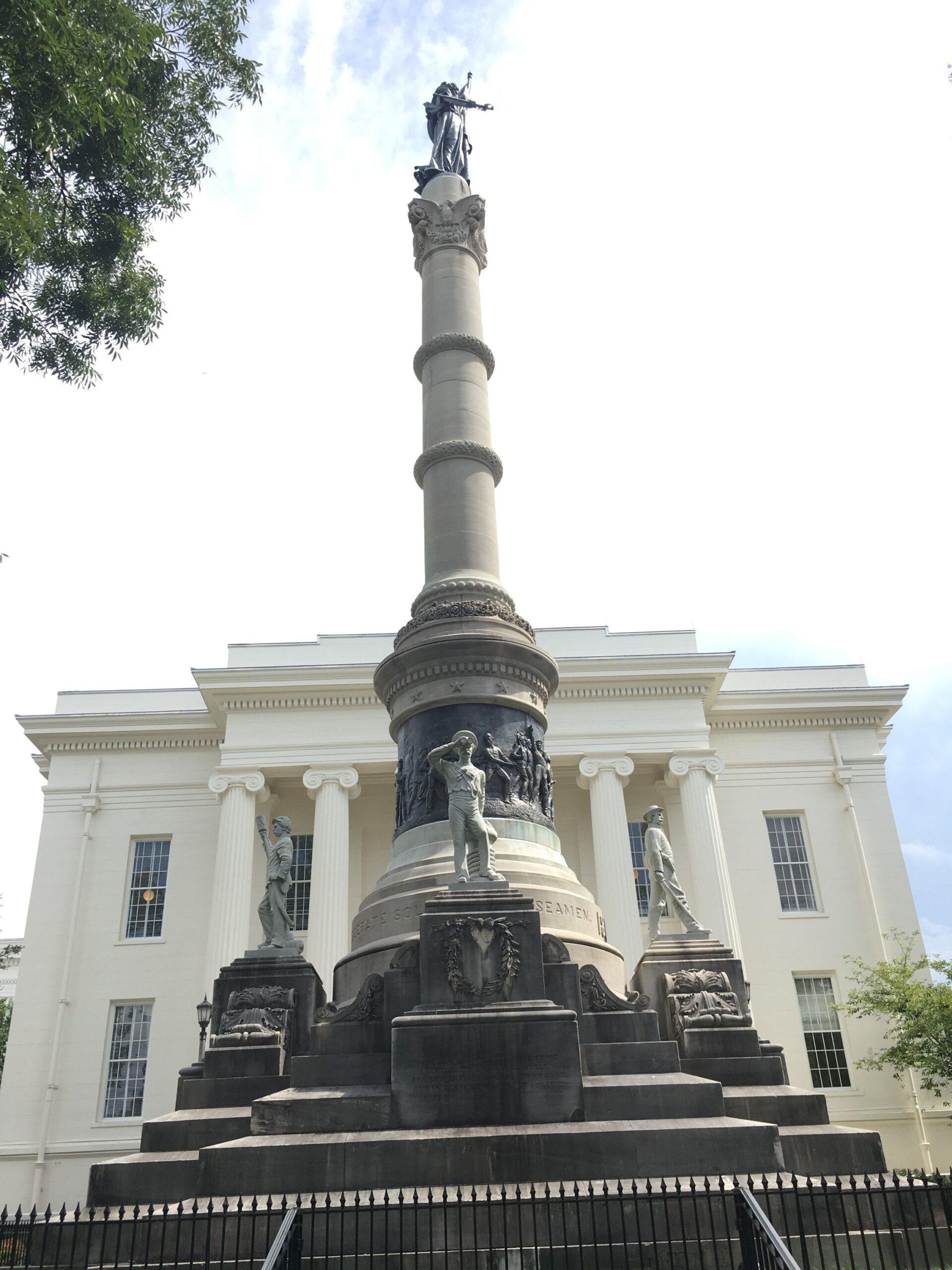 Montgomery built its own monument in 1898, an 88-foot-tall structure on the Capitol grounds that celebrates the four branches of the Confederate military and is topped by an allegorical figure representing patriotism. Jefferson Davis himself laid the cornerstone for the monument in 1886, and 12 years later a large dedication ceremony reinforced the notion that the Civil War was a principled fight for liberty that echoed the Revolutionary War.