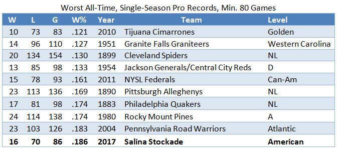 What they don’t lack is losses. After being swept by St. Paul and dropping three of four in Gary, their record stands at 10–55. That’s a .154 winning percentage, which puts them 27 games behind Wichita in the American Association’s South Division, in firm possession of the worst pro record at any level in 2017, and within slumping distance of the worst professional record of all time. (Their record has improved only slightly since then; the Stockade are now 16–70 and 36 back.)