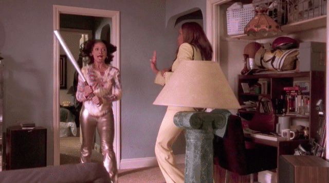 Both the precipitating argument and the impromptu apartment redecoration were raw, rare breakthroughs for a character whose problems stem primarily from a refusal to confront—and communicate—her emotions. But the apartment trashing is notable beyond its function as an unusually transparent window into Issa’s distress. The scene evokes a particularly memorable vignette from the 2001 romantic comedy Two Can Play That Game, the battle-of-the-sexes romp that follows Shanté Smith (Vivica A. Fox), a marketing executive and self-appointed relationship guru. While the film focuses on Smith’s own relationship woes, one early scene finds her narrating a confrontation between her friend Tracey (Tamala Jones) and Tracey’s boyfriend, Dwain (Dondre Whitfield). Enraged that Dwain doesn't have a plausible excuse for her questions about his infidelity, Tracey proceeds to break several items in his living room. Delivering the final blow to their relationship with a pre-Lemonade bat, Tracey demolishes one of Dwain’s lamps. Breaking the fourth wall in a signature move, Shanté delivers some advice to male viewers as Tracey wrecks the wayward Dwain’s apartment: “Let me ask you … why do men let women come over their house and break shit? That don’t make sense. When you do your dirt, go over her house … so when she gets mad, she can bust up all of her shit.”