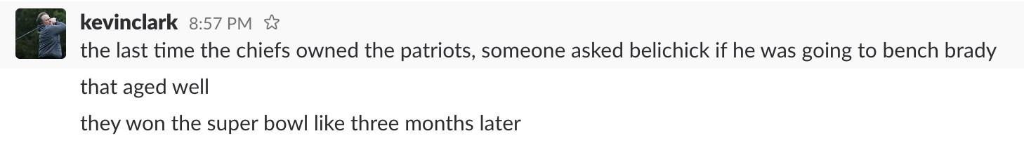A few days before the night Alex Smith made Tom Brady look like Alex Smith, Chiefs linebacker Justin Houston revealed Kansas City’s secret plan to stop the Benjamin Button of signal-callers: “hit him.” Houston did that, accounting for two of K.C.’s three sacks of Brady. But this wasn’t one of those games where Tommy looked trapped in a piranha bath. He had clean looks, and that’s what should worry Pats fans. He wasn’t hurried. He was bad.