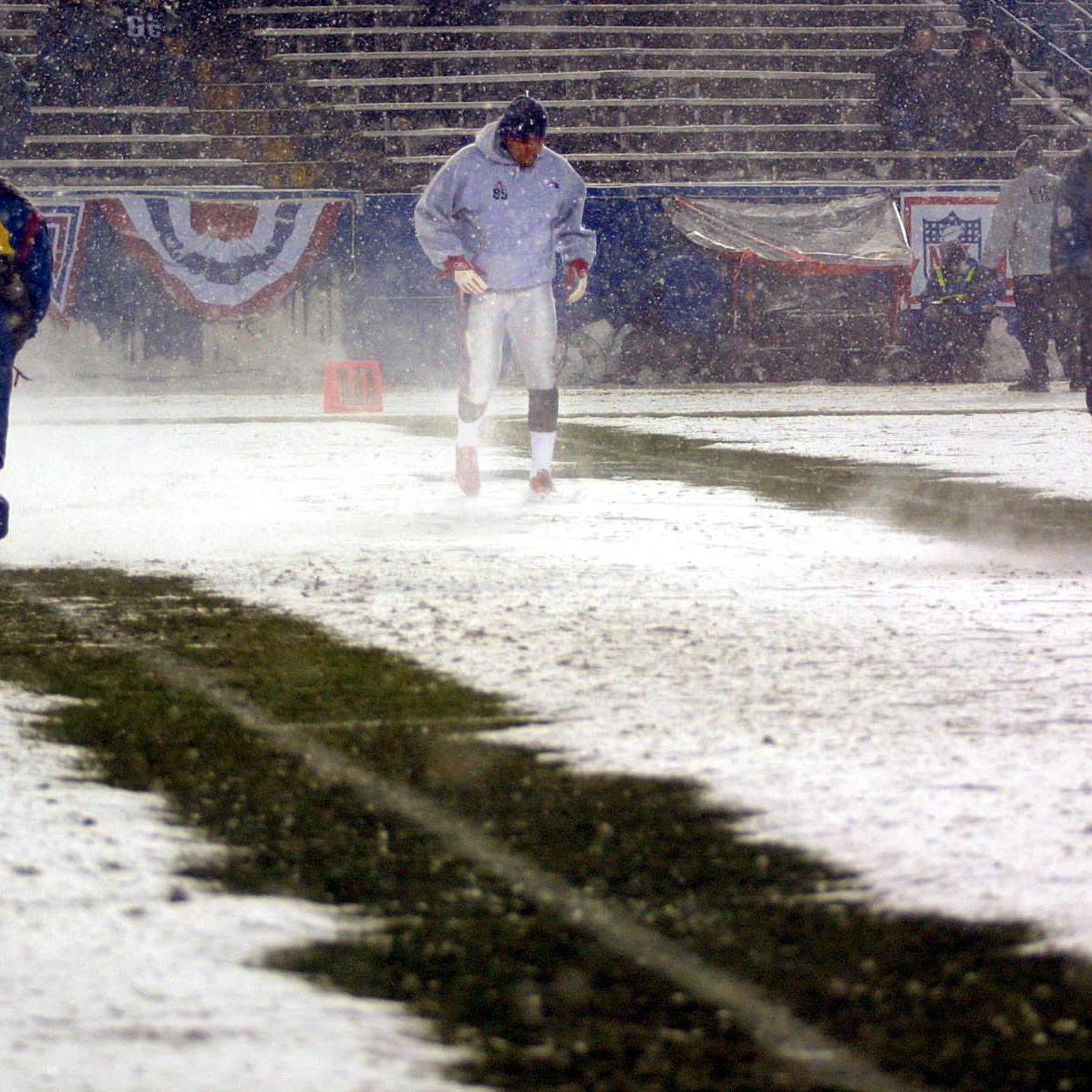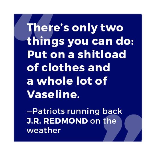 Vinatieri: We’d once played in Buffalo in one of those 50-mile-an-hour-wind games, where you’re spreading your legs apart, leaning into the wind so it won’t blow you over. But that was probably the most snow I’ve seen coming down during a game.