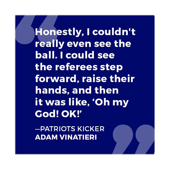 Vinatieri: I still held my breath until it finally went through. Honestly, I couldn’t really even see the ball. I could see the referees step forward, raise their hands, and then it was like, “Oh my God! OK!”