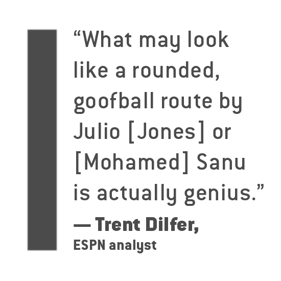 Size and speed at receiver have always mattered, but the difference is how the savviest teams are now deploying those bodies. These pass catchers excel on wide-open plays that seem simple but are in fact a science. “What may look like a rounded, goofball route by Julio or Sanu is actually genius,” says Dilfer.