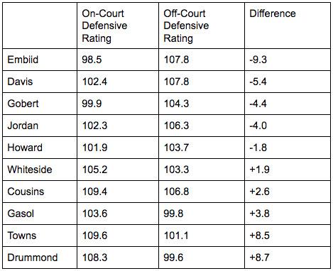 Playing interior defense is one of the hardest things in the NBA to master, and it’s even harder when you don’t have experienced defenders in front of you. Embiid is making it look easy, even though he’s a rookie who hasn’t played basketball in more than two years. His performance is particularly impressive in comparison with fellow youngsters like Karl-Anthony Towns and Andre Drummond, whose teams play significantly worse defense when they are on the floor.