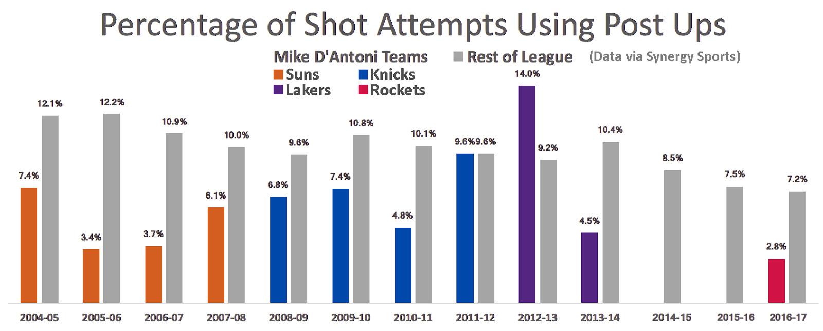 It’s not that the Rockets don’t care about posting up their bigs. It’s just not a priority. "It just doesn’t happen to be the best shot in our arsenal. It’s down the list. We don’t want to go straight to there; it doesn’t make a whole lot of sense," said D’Antoni. The Rockets score a measly 0.69 points per possession on post-ups, per Synergy, and use them the least frequently in the NBA. This has been the case nearly every single season of D’Antoni’s coaching career this century.