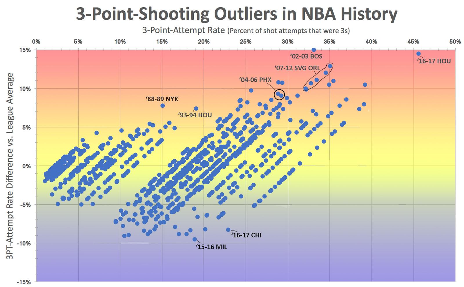 The chart below shows how much of an outlier the Rockets are by visualizing the 3-point-attempt rate versus the league average for every team in league history. For example, the 2016–17 Rockets attempt 45.7 percent of their shots from 3, which is 14.4 percent above the league average.