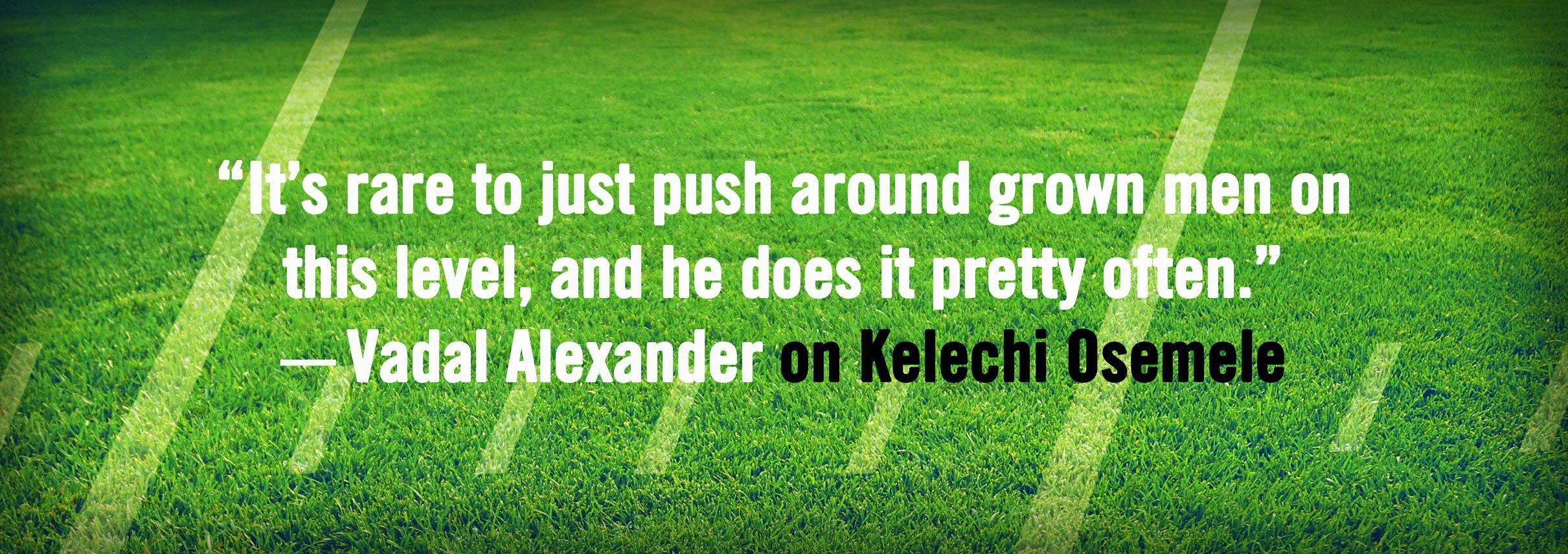 When Alexander first saw the way Osemele blew people off the ball, he had to ask his teammates if that type of destruction was typical in the NFL. “It’s rare to just push around grown men on this level, and he does it pretty often,” Alexander says.