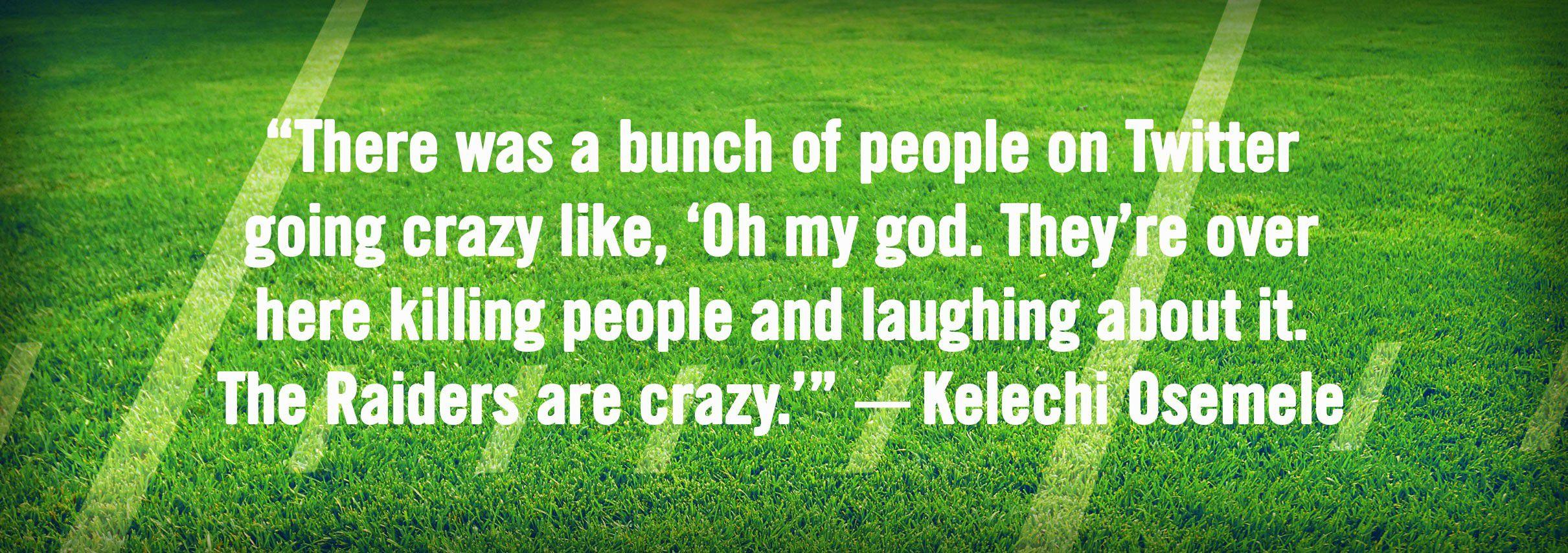 “There was a bunch of people on Twitter going crazy like, ‘Oh my god,’” Osemele says, sitting in front of his locker at the team facility in Alameda, California. “‘They’re over here killing people and laughing about it. The Raiders are crazy.’”