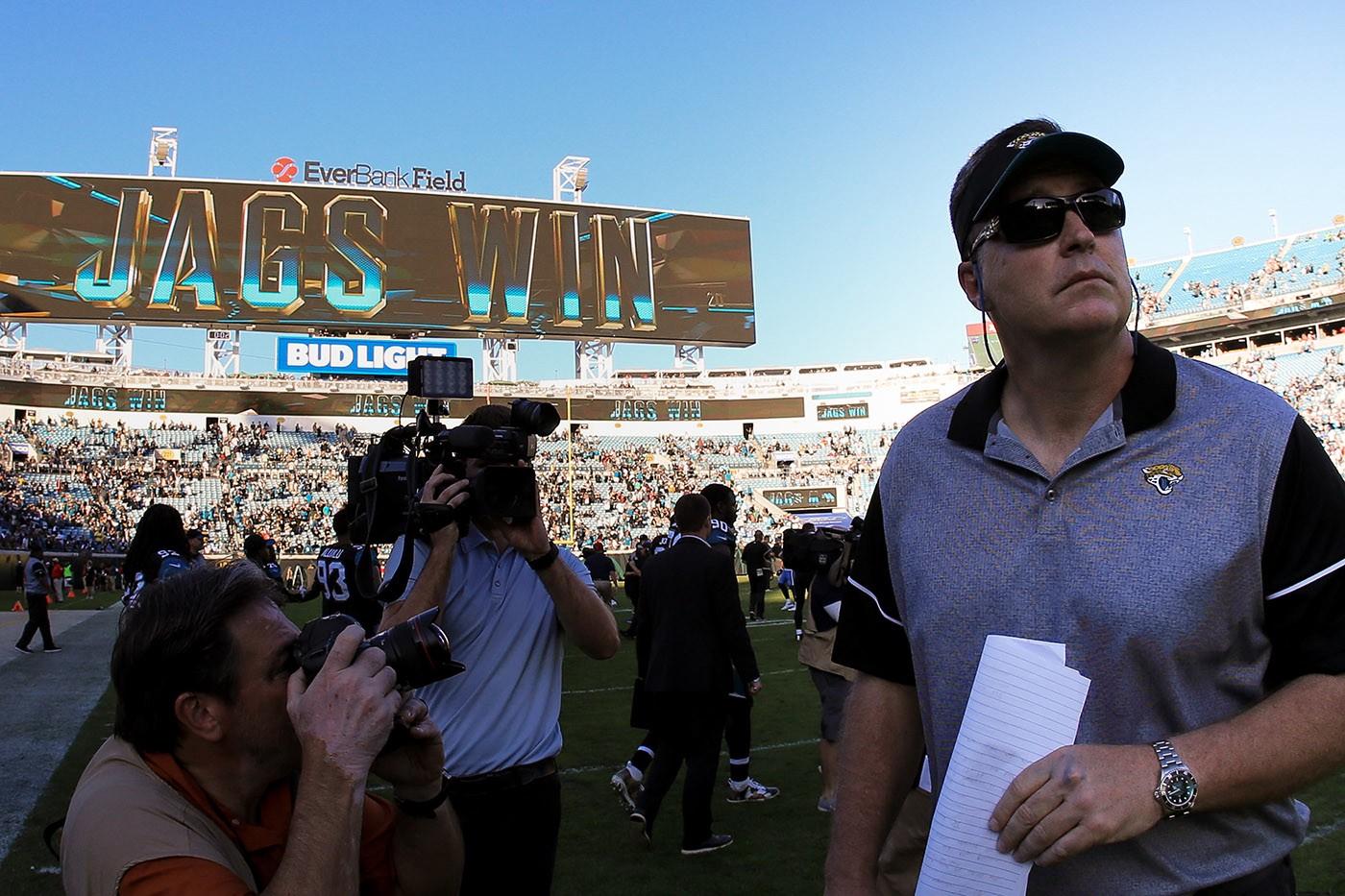 Friends, I’d heard the expression “damning with faint praise” before, but I’d never really understood it, felt one with it, until “Doug Marrone did great things at Syracuse” flashed on my computer screen. The Jaguars are chest-deep in a swamp of irrelevant mediocrity and have been since the turn of the century, so I guess their plan is to tint their uniforms gold, play a bunch of games in London, and bore their way to the playoffs? Because the most boring thing to do is to promote the interim coach — that is, the guy who was just lying around when you fired the last coach — particularly if he’s a retread, and particularly if he’s Doug Marrone, who was a human cloaking device when he coached the Bills.