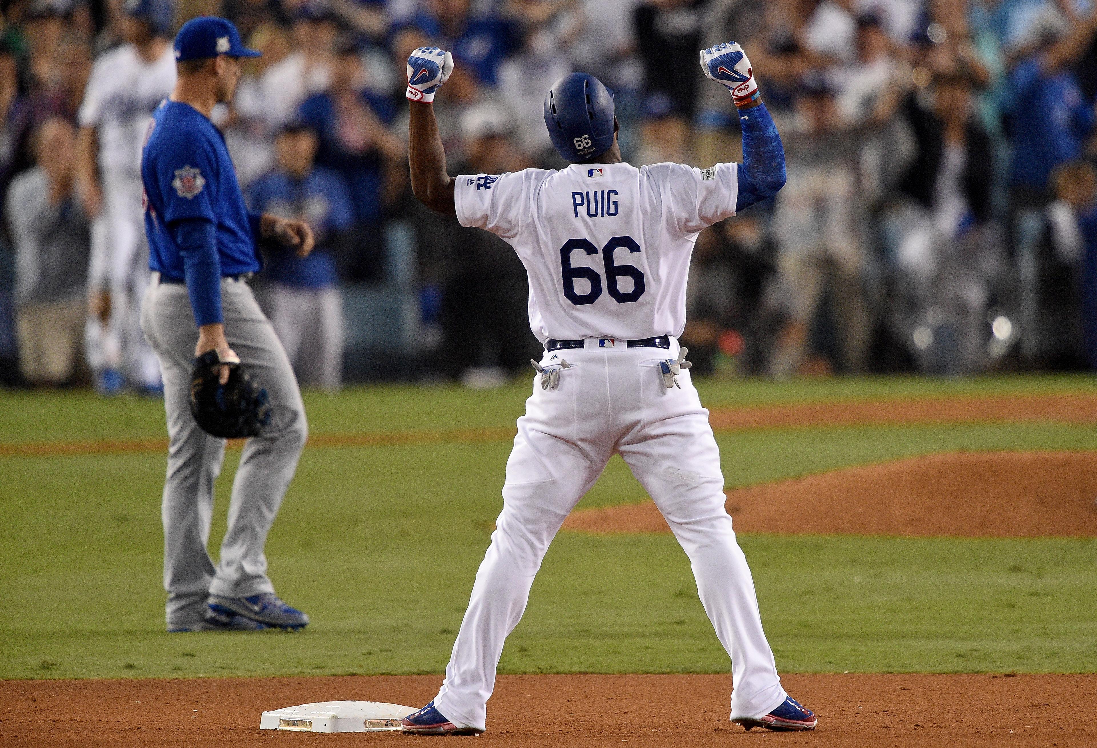 His hit didn’t quite reach the stands, but it did carom off the wall, giving the Dodger fan favorite a resounding RBI double. It was the fifth inning of Game 1 of the NLCS and his team was trailing 2-0, having sent the minimum number of hitters to the plate through four innings against Cub southpaw Quintana. But a pair of one-out walks gave Dodger Stadium life for the first time since the early innings, and with chants of “Let’s go, Puig” streaming through the stands, the right fielder answered the plea.