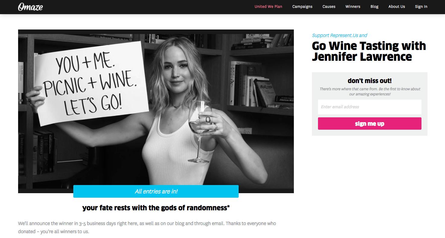 Represent.Us, the anti-corruption nonprofit that benefited from the recent campaign offering wine-tasting with Jennifer Lawrence, was similarly grateful for the manpower that Omaze brought to the table. The Massachusetts-based organization frequently produces videos for its Facebook, Instagram, and YouTube channels that range from sober tales about how lobbyists’ influence affects people on an individual level to satirical campaign ads poking fun at corrupt politicians. The group even filmed a video in which it asks Martin Sheen to answer the question “What’s the problem with money and politics?” (The YouTube description reads: “His unscripted response shocked us.”) According to associate communications director Tzipora Lederman, the team is careful to balance attention-grabbing efforts with content that serves the organization’s objectives. “We want to avoid clickbait and other gimmicks,” she wrote in an email. “We are nonpartisan so we are careful to avoid content that is unfairly targeting one side of the aisle, all of which are ways of driving traffic.” But even with a capable content marketing team, coordinating the logistics of a large and far-reaching sweepstakes for an experience with Jennifer Lawrence would’ve been overwhelming without Omaze. “It became clear over the course of the campaign that they have an incredibly robust organizational structure to oversee every detail of the campaign from start to finish,” Nora Gilbert, director of strategic projects and partnerships, wrote in an email. “In the last few months, we’ve interacted with a range of teams from business development to legal to partnerships to video production to merchandise to experience and more.”