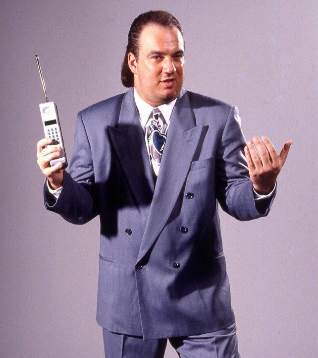 The oversize mobile phone was a staple of Heyman’s Paul E. Dangerously shtick. Yuppie scum personified, Dangerously bragged about his Wall Street connections, his cash, and his lawyer daddy. Cokehead sunglasses, suspenders, and a glorious mullet were his trademarks. He was a baby Gordon Gekko. And when he opened his mouth, my God, the vile things he said. In an era when managers went for laughs (think Bobby “The Brain” Heenan), Dangerously made it personal. It was a different kind of heat.