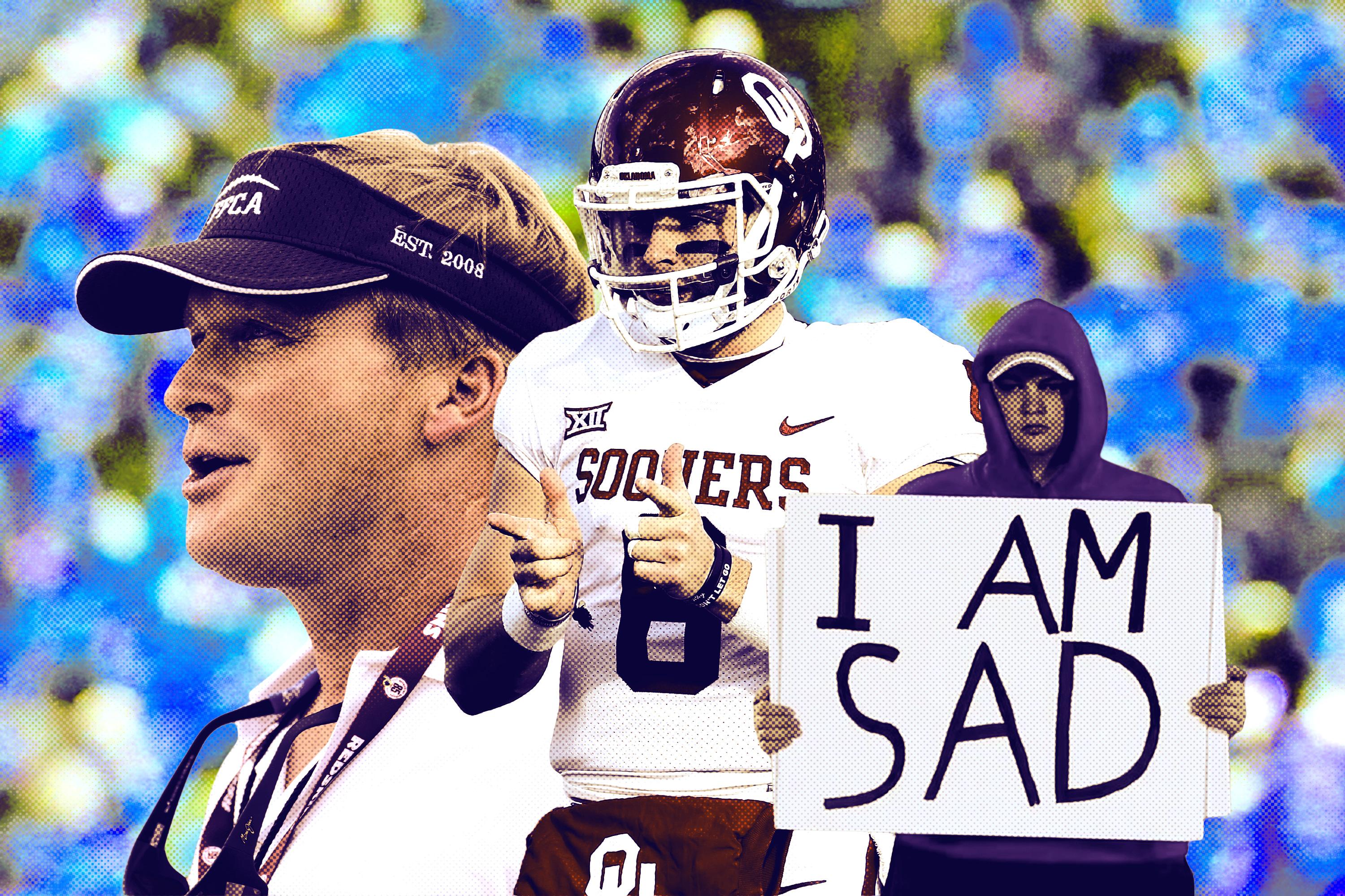 When Mayfield strutted and screamed against Kansas, one of the worst teams in college football, suddenly even more people had Mayfield opinions than usual. Even those who supported Mayfield when he celebrated one of the biggest wins of the season with an over-the-top attempt at a flag plant could have been swayed by Mayfield shaking his junk at Kansas, or telling winless Baylor “I’m gonna have to spank you today.” Mayfield also spent Saturday mocking the poor Kansas fans who made their way to watch their 1-10 football team get throttled.