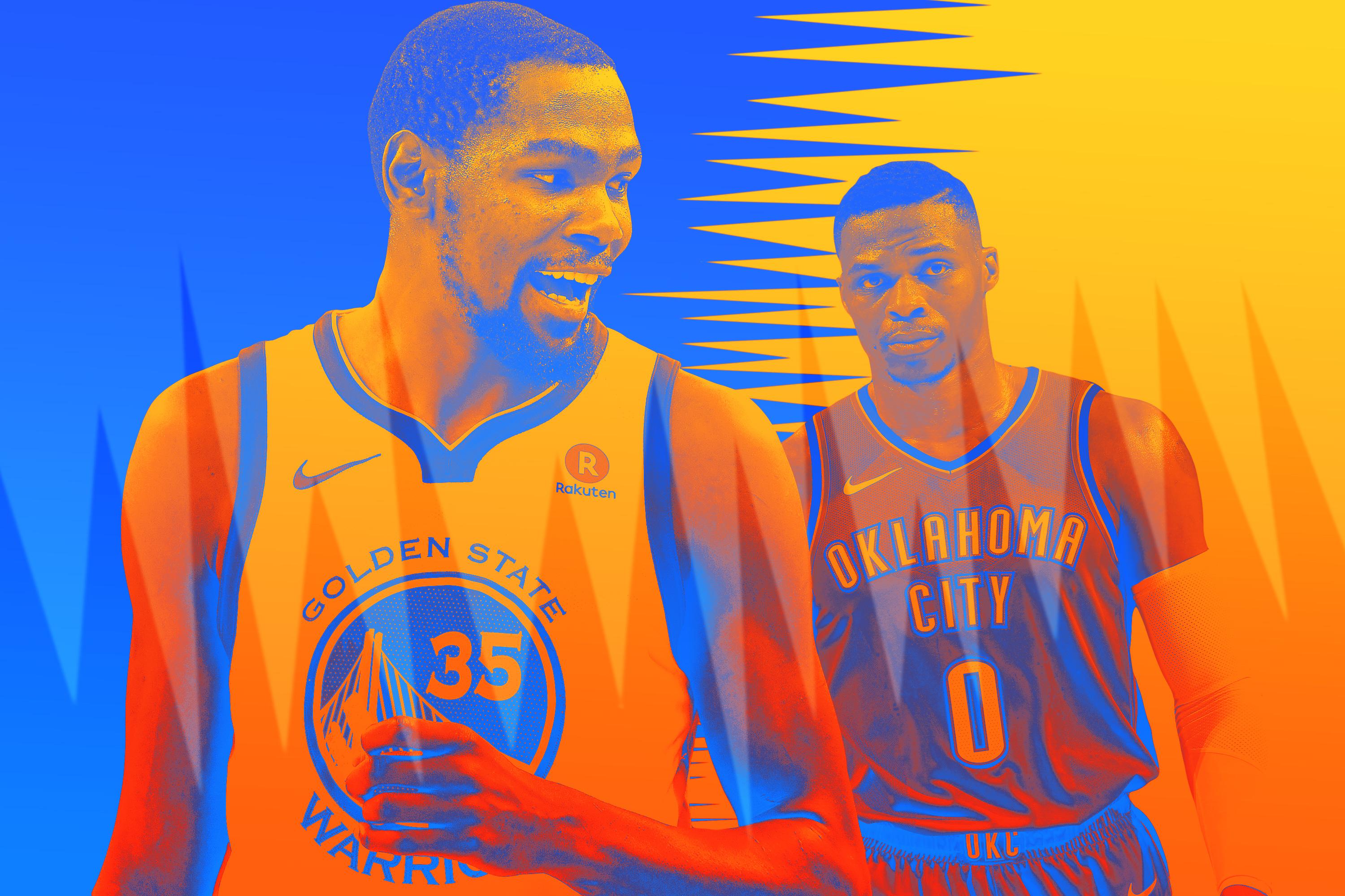 For eight years, the union between Kevin Durant and Russell Westbrook in Oklahoma City was defined by polarity. But if Year 1 of their conscious uncoupling was about finding and leaning into their true selves — Durant embracing his identity as the NBA’s most devastatingly talented wallflower while Westbrook engorged himself as basketball’s id — Year 2 has taken their duality in a different direction. Durant’s fake Twitter debacle underlined some of the insecurities he has with his own narrative, but on the court he’s never looked more at peace. Westbrook’s unveiling of a new streetwear line feels like both a passion project and a convenient distraction from what he’s had to deal with on the court — a tumultuous feeling-out process with the additions of Paul George and Carmelo Anthony that hasn’t yet bore fruit. Both players have seen their scoring average dip far below their career norms. Durant’s 24.9 points per game is the lowest since his rookie season; Westbrook’s 20.1 is the lowest since his sophomore season. Yet the circumstances behind the numbers couldn’t be more different, and their two divergent paths offer two perspectives on the superteam quandary.