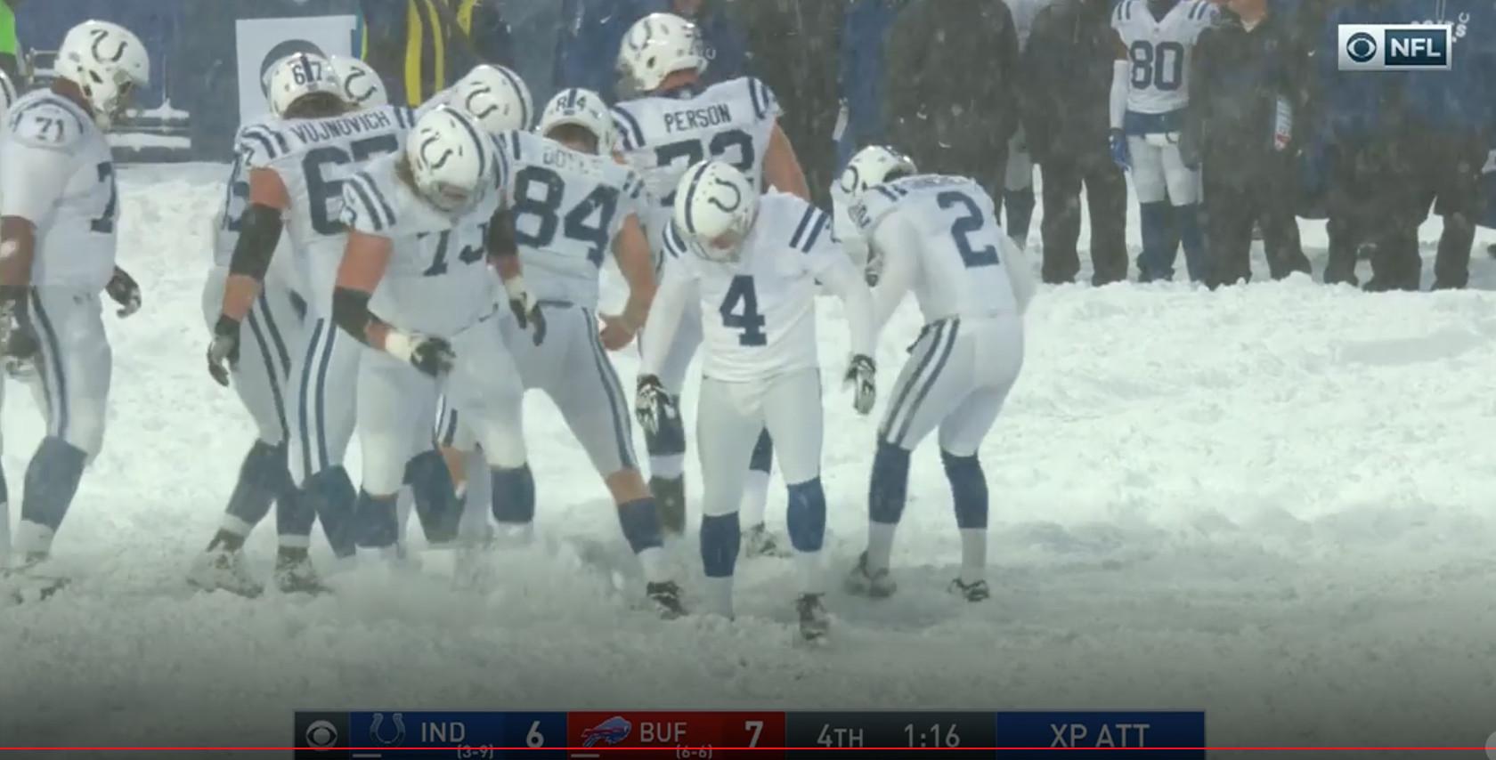 Though the attempt was from 43 yards, Pagano opted for a PAT from Vinatieri. That led to a mad scramble by the Colts PAT unit to frantically clear the snow away from Vinatieri’s plant spot, which resembled a herd of caribou doing ballet.