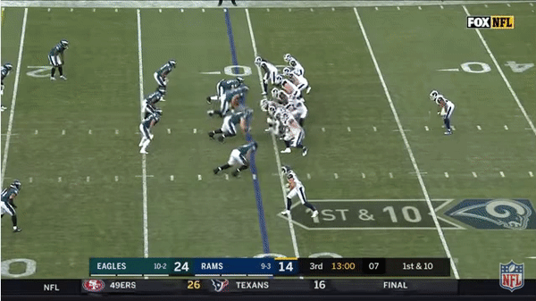 10. This week in tales of the tape: The Rams have an endless array of play-action wrinkles, and each one has a distinct purpose. Check out this design from the third quarter of L.A.’s loss to the Eagles. On a first-and-10 from Philly’s 29-yard line, the Rams line up with three receivers (including tight end Tyler Higbee) bunched to the right side and Cooper Kupp isolated to the left. At the snap, Jared Goff fakes a handoff to running back Malcolm Brown while both Higbee and wideout Pharoh Cooper stay in to block on the right side. Cooper is an unlikely blocker in this scenario, but the goal of this play is to give Goff as much protection on the right side as possible so the Rams can alter the launch point of his throw. The protection also allows Kupp’s slow-developing iso route on the back side to develop.