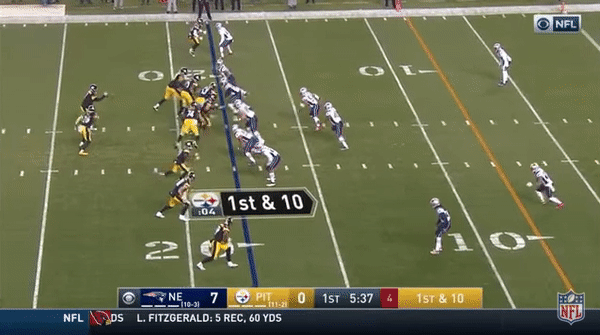 Most of the time, when teams run a twist that involves an interior player slanting outside and an edge rusher looping inside, the goal is to create a free lane for the quicker rusher while the bigger guy occupies two blockers. For the Steelers, it’s the interior guys who often become the real pass-rush threat on these plays, and that’s because Tuitt and Cameron Heyward are too strong for opposing tackles to slow down in close quarters. On Tuitt’s quarterback hit to force a crucial third-down incompletion late in the third quarter, he was too explosive for Pats backup right tackle Cameron Fleming to pick off while Fleming was trying to recover. Pittsburgh runs a ton of games designed to get Tuitt and Heyward to the quarterback, and the success of those stunts will play a key role in the Steelers’ playoff fortunes.