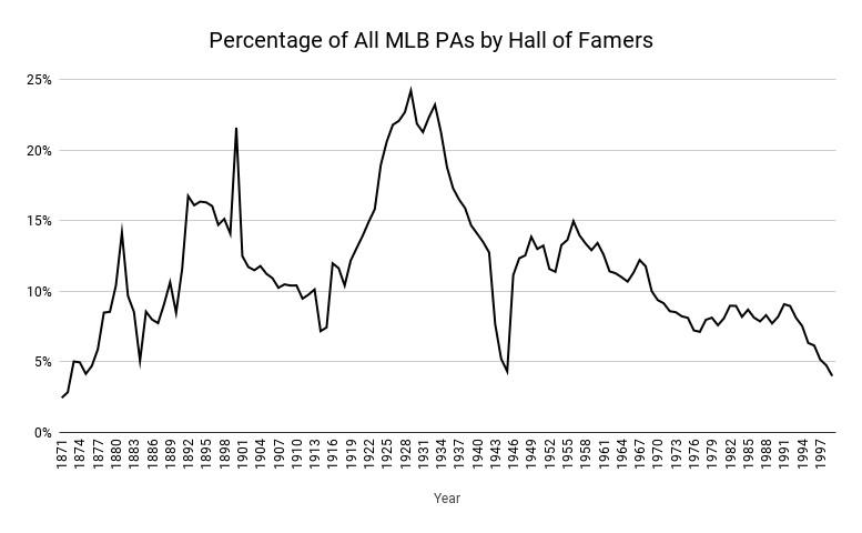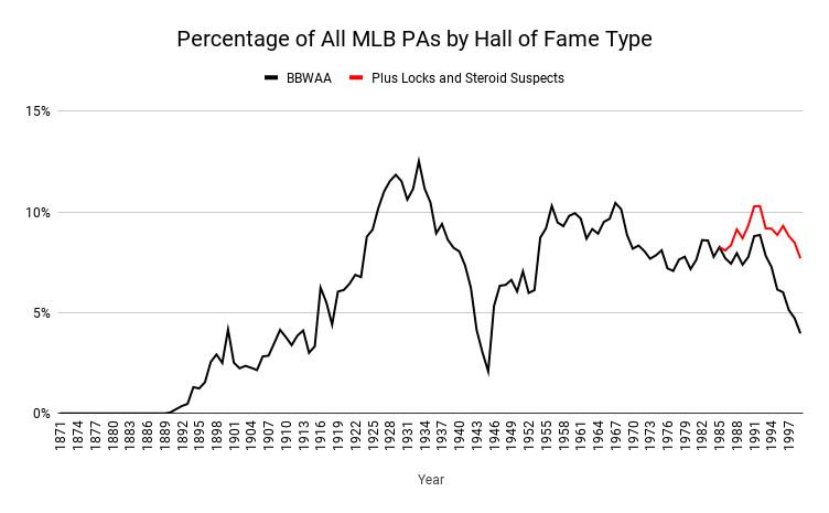 Considering PED-implicated players helps address the decline posed by that first plate appearance graph, too. Limiting the Y-axis to BBWAA elects already starts to even out the bouncing trend line, and the remaining gap at the back end of the 20th century disappears entirely after adding in either players who are Hall locks (Adrián Beltré, Vladimir Guerrero, Roy Halladay, Hoffman, Derek Jeter, Chipper Jones, and Jim Thome) or players who would be locks had their cases not been sullied by steroid allegations (Barry Bonds, Roger Clemens, Mark McGwire, Rafael Palmeiro, Manny Ramírez, Alex Rodriguez, and Sammy Sosa). After the World War II–induced dip in the middle, the long-term trend is rather consistent and evinces a higher rate than is seen for much of the early 20th century.