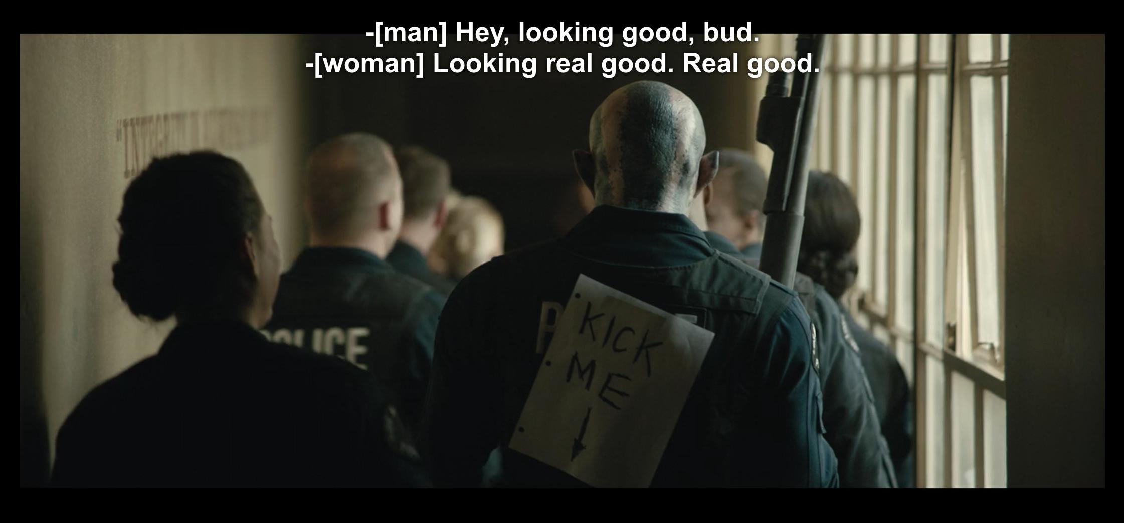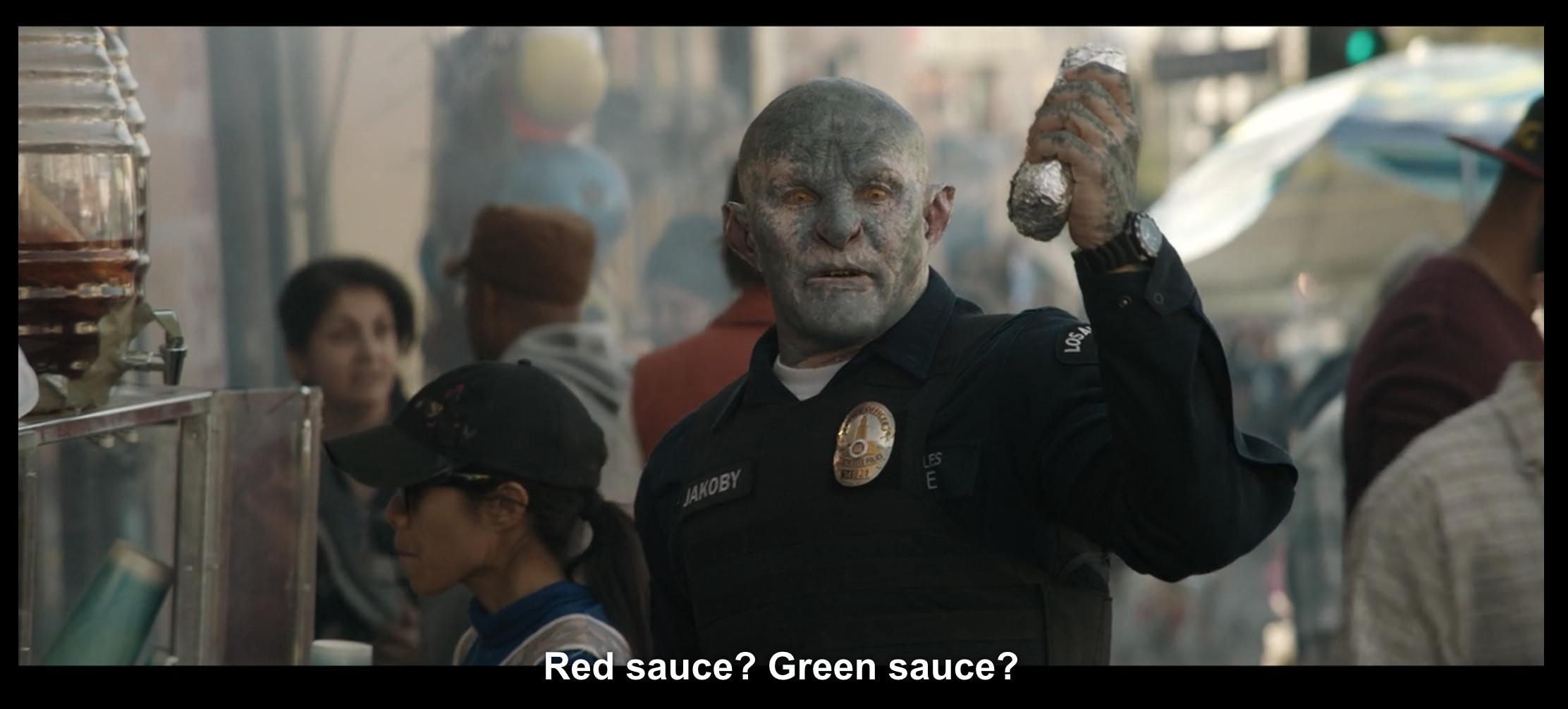 7. Actually, no burrito sauce for anyone. As we find out, Edgerton is Nick Jakoby, the first orc cop in the LAPD, and he’s been partnered with human cop Daryl Ward (Will Smith). Unfortunately for Daryl, teaming up with the first orc cop means he’s a huge target for orc gangsters, one of whom shoots Daryl in the chest while Nick is buying a burrito. Daryl survives thanks to his bulletproof vest, but he never did get to enjoy that sauce. By the way, is Daryl close to retirement, like every other cop in every cop movie ever made?