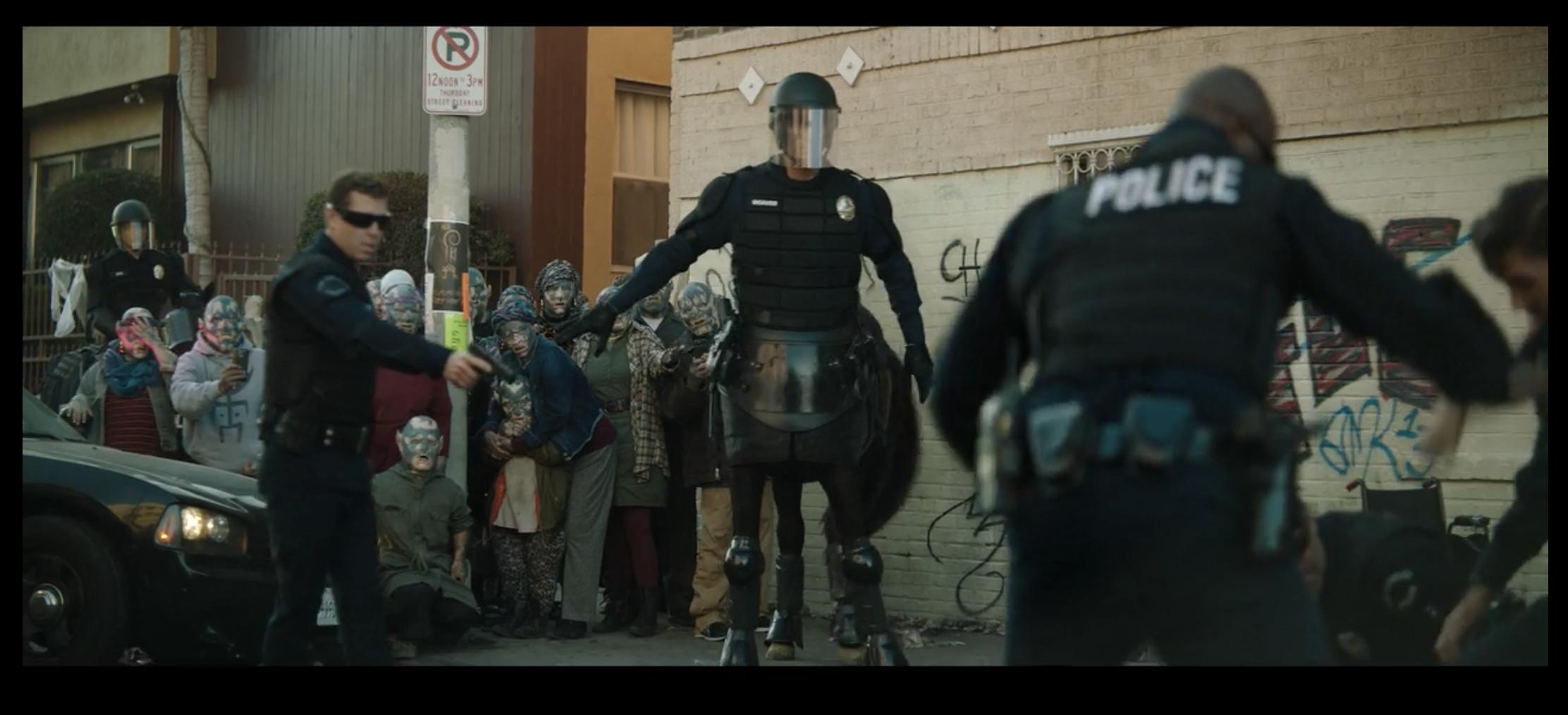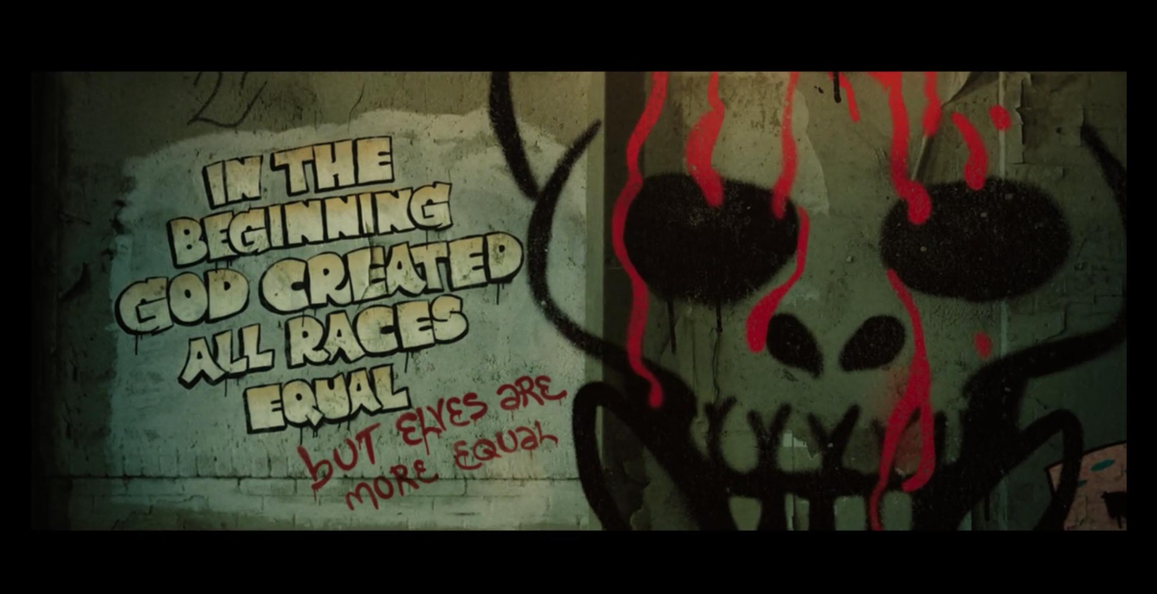 4. The opening credits are supposed to function as world-building, to ease the audience into a present-day Los Angeles where humans live alongside orcs, elves, and fairies. Much of this is established through unsubtle graffiti.