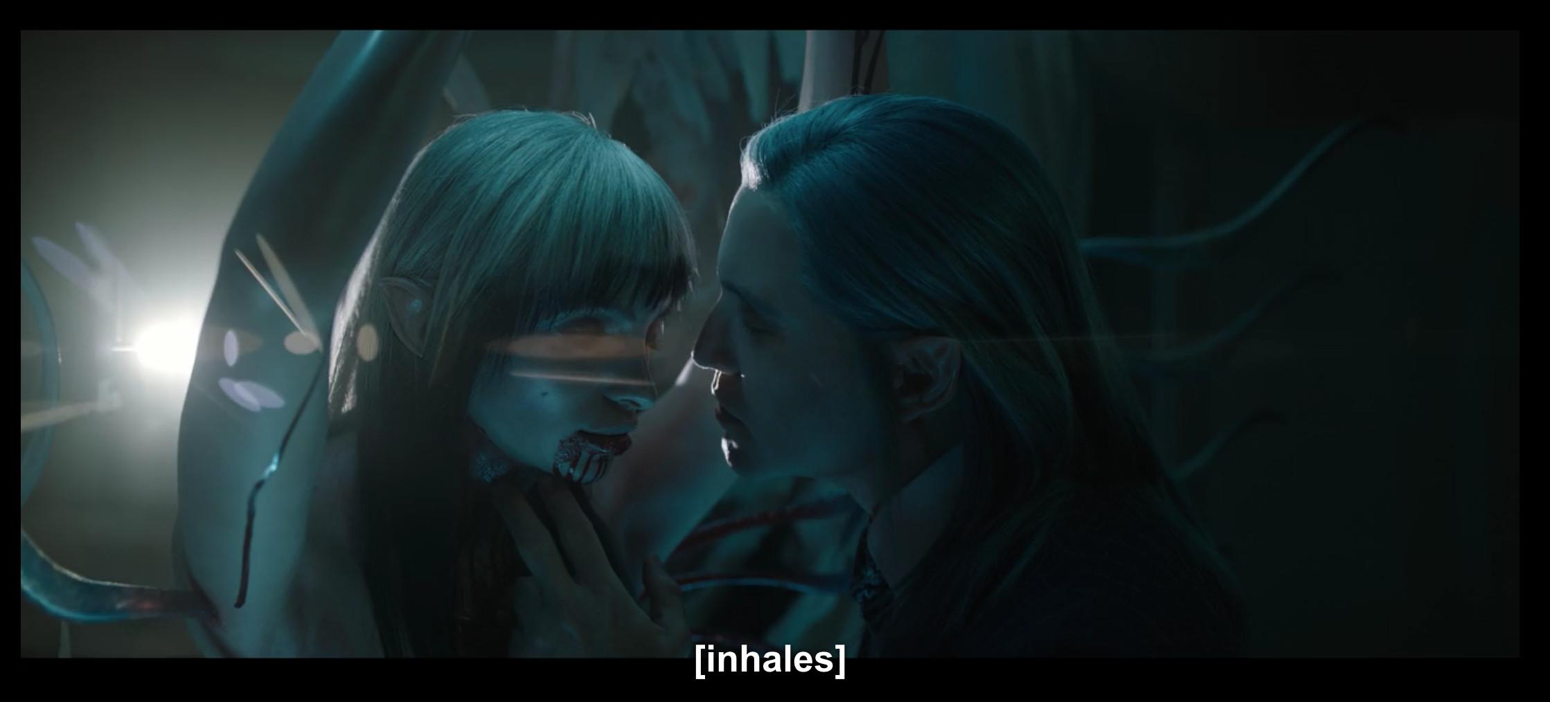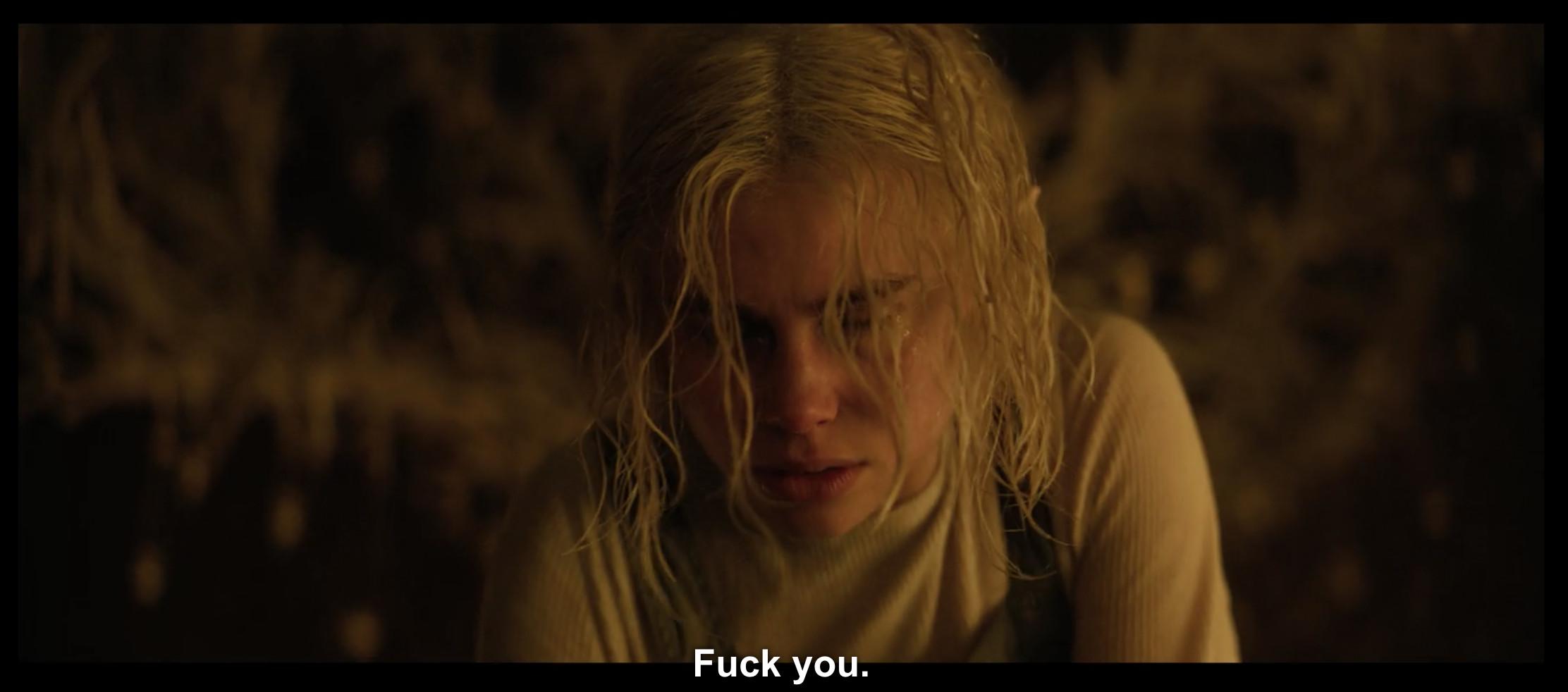 26. The rest of Bright is, as follows: Nick and Daryl try to get an elf named Tikka (Lucy Fry) to safety while being pursued by an evil elf, Leilah (Noomi Rapace), who wants to resurrect the Dark Lord, while other people try to grab the wand ad nauseam in chaotic, incoherently dark gunfire. Is it possible to describe how this movie treats the audience in one screenshot?