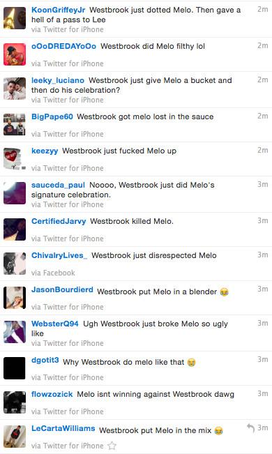 With just over five minutes to play in the fourth quarter and the Thunder up eight (at one point in the first half, they’d trailed by 17), Westbrook missed a free throw, grabbed his own rebound, Harlem Globetrottered through the paint, passed the ball, got it back, faked Melo all the way to Cleveland, hit a 3-pointer, and then mimicked that stop-hitting-yourself head-poke. Twitter reacted accordingly.