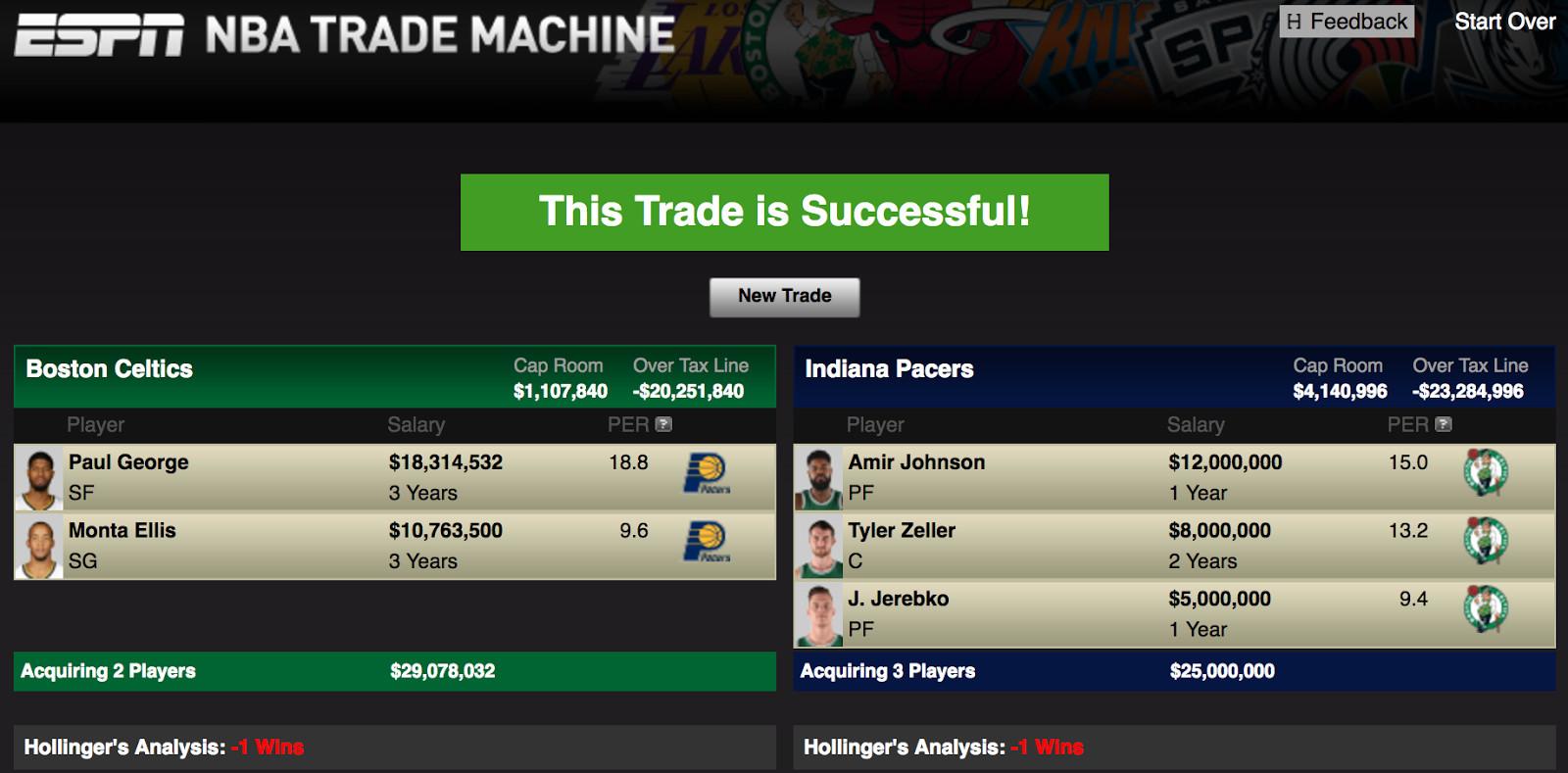 What would Indiana’s version of a George dream trade even look like? The Celtics would be their first call: Indy would ask for both Brooklyn picks, get shot down, then ask for Jaylen Brown (last year’s no. 3 pick, and a potential stud), Brooklyn’s 2017 first-rounder, expiring contracts and another no. 1 pick (maybe Boston’s Clippers pick that starts losing protections in 2019). They’d also insist on Boston eating Monta Ellis’s contract, Gerald Wallace–style. Something like this: