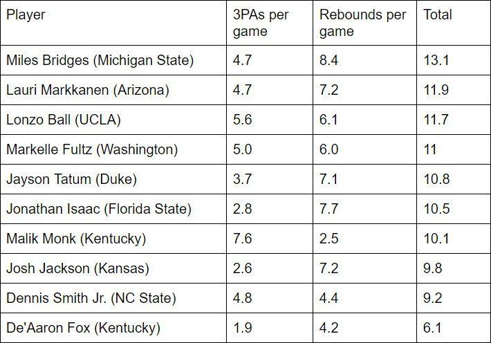 Bridges is averaging 16.2 points, 8.4 rebounds, 1.9 assists, 0.7 steals, and 1.7 blocks a game on 49.8 percent shooting this season. What makes his role at Michigan State unique is his combination of volume rebounding and 3-point shooting. He grabs rebounds like a big man and shoots 3s like a guard. Look at how his averages in both categories compare to the other elite freshmen in The Ringer’s NBA Draft Big Board:
