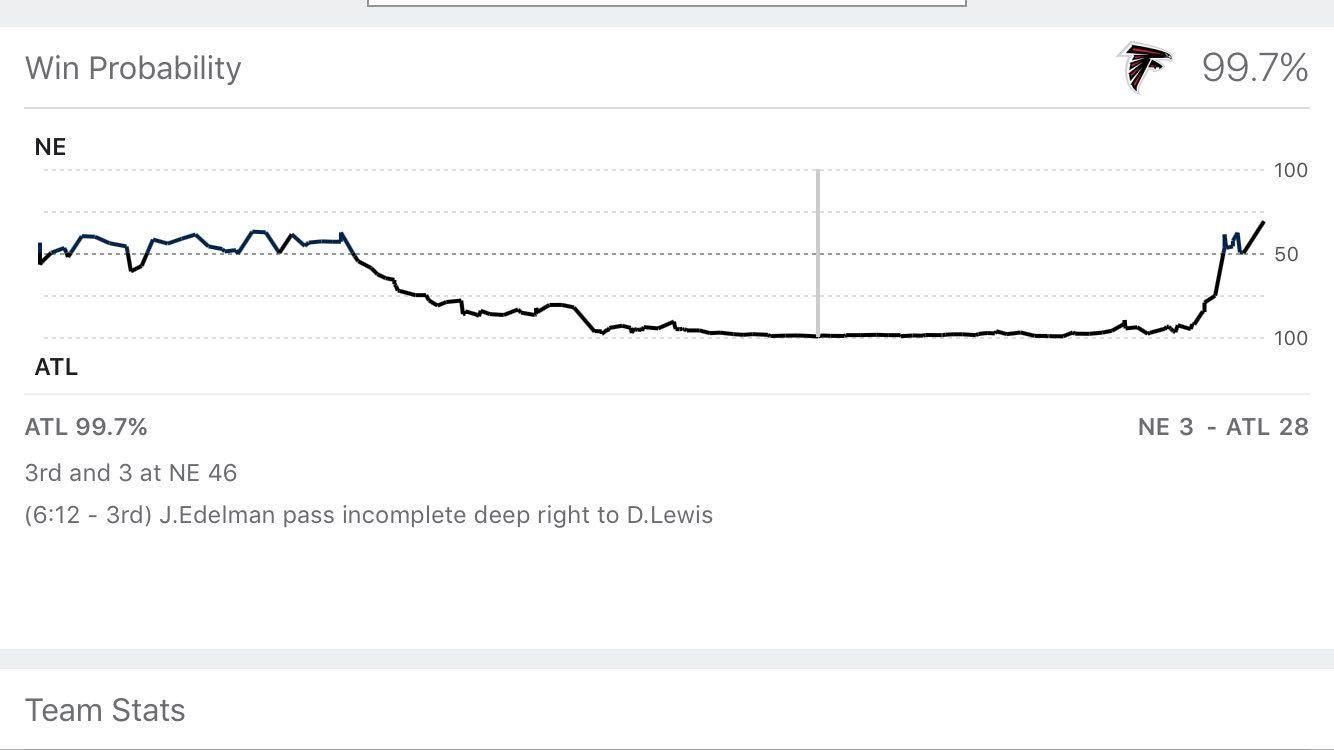 The first Super Bowl victory in Atlanta history seemed to be sealed. When the Falcons pushed the lead to 28–3 in the third quarter, ESPN’s win-probability chart gave them a 99.7 chance of winning: