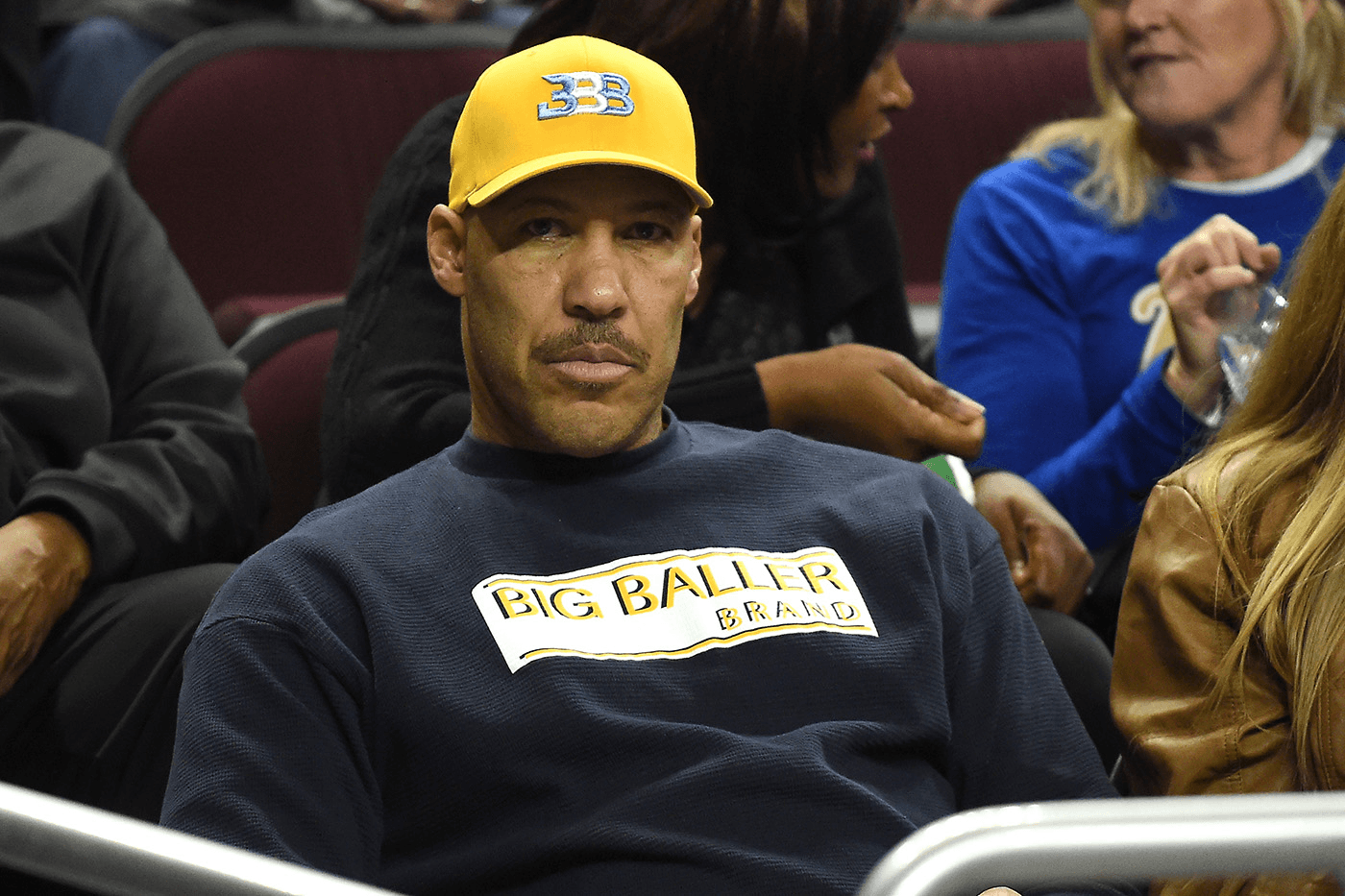 LaVar wears his own blue-and-yellow Big Baller Brand shirts to cheer on his son, whose school profits off his labor and likeness for free. Respect.