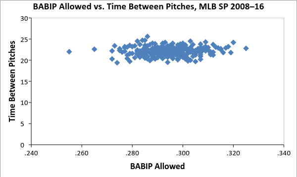 Let’s drill down to the individual level. This second scatter plot, which includes all qualified starters from 2008–16 who spent a full season with one team, shows the difference between pitcher BABIP and team BABIP, again plotted against time between pitches. If working more quickly were a dependable way for pitchers to solicit stronger defense than their slower-working rotation mates, we would expect to see some relationship here.