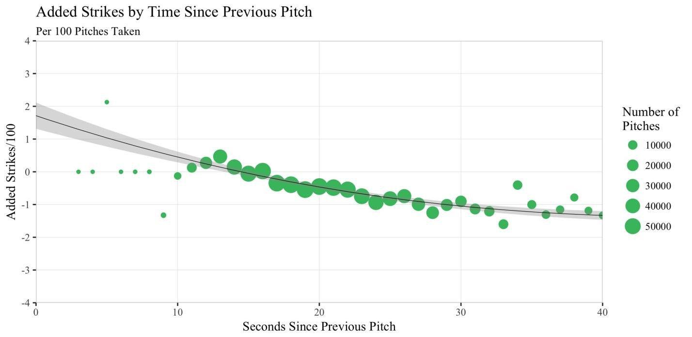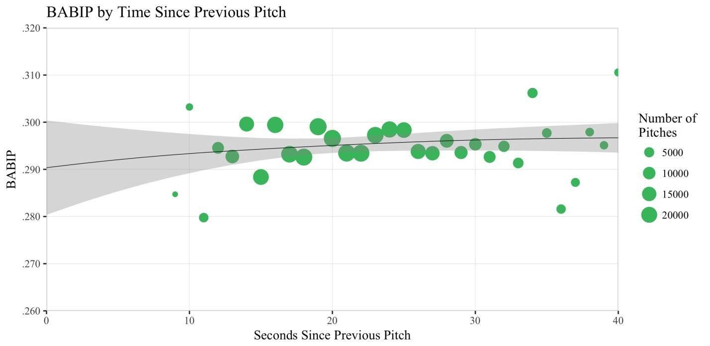There’s a slight upward trajectory to the trend line, suggesting a slight tendency for pitches after longer delays to have higher BABIPs allowed. However, the apparent effect is small and seems to be concentrated at the smaller-sample extremes; quick pitches may catch hitters off guard and produce more defensive, less successful swings, but there’s essentially no difference in results throughout the 15–30-second range in which the vast majority of pitches cluster. When we consider that there’s also a separate, if minor, tendency for better hitters to both have higher BABIPs and take more time between pitches — which could slightly skew these results in the direction of a real relationship — any existing leaguewide effect would be weak.