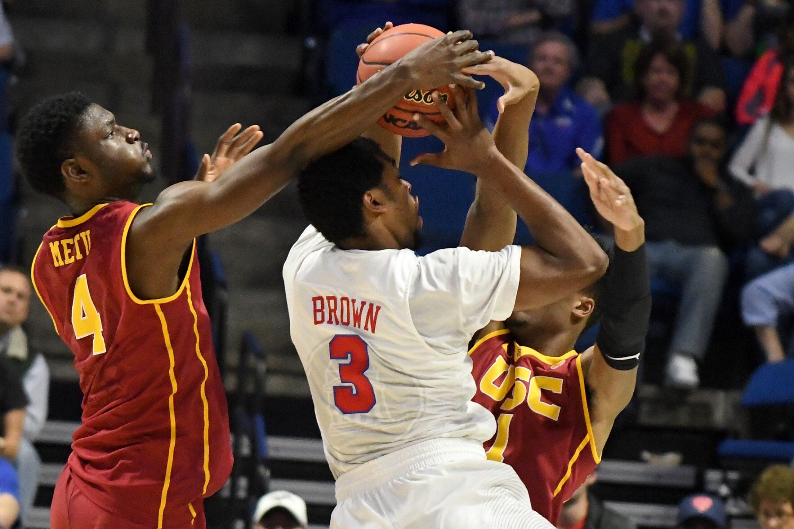 Yet until the very end, the defense could only pull USC close, not push them over the hump. The problem: USC was flummoxing SMU on defense, but shot an abhorrent 6-of-27 from behind the arc. With 3:35 left, the Trojans were down four when Elijah Stewart missed the team’s 21st 3-pointer of the game. But as Stewart’s shot rattled off the rim, freshman De’Anthony Melton rose for the rebound and grappled it away from Mustang defenders. In one move, he pushed into the paint for a layup, which cut the lead to two points.