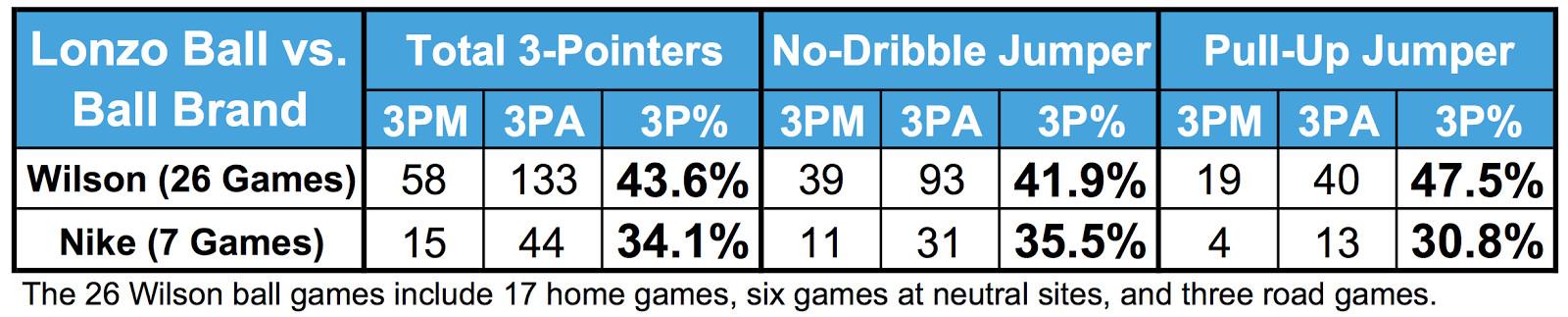 Ball’s teammates shoot roughly the same from 3 with Nike balls as they do Wilson balls, but for individuals — like Ball and Powell — the brand might make a difference. The NCAA uses Wilson for March Madness, so the ball shouldn’t be a factor this month. But not all Wilson balls are equal. “They always use brand new balls that have branding on them. They’re never broken in at all,” a former international basketball player told me via text. “Tourney balls are always tough to shoot, in my opinion.”