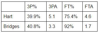 Hart and Bridges have vastly different roles at Villanova. Hart is a senior All-American who leads the team in scoring, while Bridges is a sophomore who plays almost exclusively off the ball and isn’t asked to carry a heavy load on offense. What they have in common is shooting ability, with the volume and efficiency from both the 3-point line and the charity stripe that bodes well for their NBA transition.