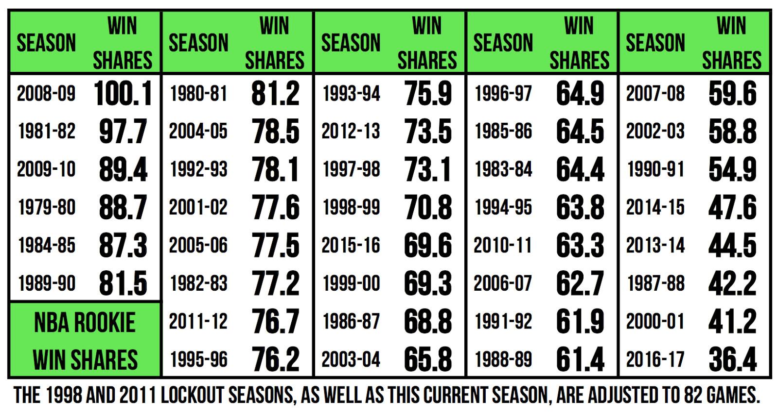 This is unsurprising considering the front-runners for this year’s Rookie of the Year award: Joel Embiid, who was actually drafted in 2014 and appeared in only 31 games; Malcolm Brogdon, who is scoring 10 points per game; or Dario Saric, also drafted in 2014, and who spent two seasons playing in Europe and has only recently started surging in the NBA. You can’t argue with the numbers. Win shares is an objective measure that does a relatively good job of assessing production. Here are the total win shares for each rookie class since 1979: