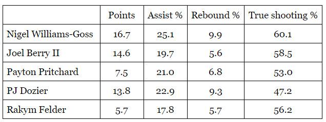 What Williams-Goss brings to the Bulldogs in terms of production is invaluable, and unmatched among the other point guards in the 2017 Final Four. The rest of the group at that position isn’t star-studded, but rather eclectic. Oregon’s Payton Pritchard is a talented freshman who facilitates but knows how to create his own shot. South Carolina’s PJ Dozier and Rakym Felder are serviceable guards who split time and set up Gamecocks leading scorer Sindarius Thornwell. North Carolina’s Joel Berry II is a former five-star recruit, per ESPN, who is well rounded and has terrific instincts. Statistically speaking, though, none measures up to Williams-Goss, who leads Gonzaga in minutes, points, assists, and steals and is second on the roster in rebounds. Among guards who made the NCAA tournament, Williams-Goss ranks in the top 15 in total rebounding rate. His average of 5.9 rebounds per game is the highest of any guard left besides Thornwell.