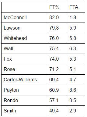 For as bad as they shoot in the NBA, the nine guys mentioned above who played college basketball all shot significantly better from 3 in their final season in school than Fox has this season. Wall is the poster child for the point guard who has succeeded in the NBA despite not being a great outside shooter, and his 3-point shooting percentage at Kentucky was one-and-a-half times higher than Fox’s.